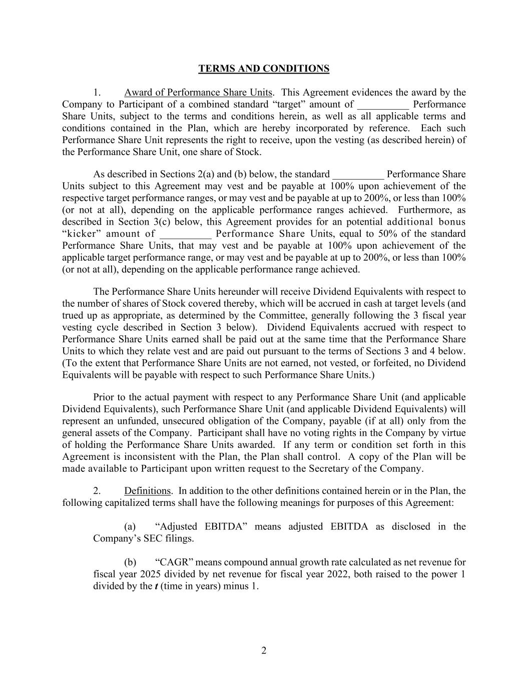 2 TERMS AND CONDITIONS 1. Award of Performance Share Units. This Agreement evidences the award by the Company to Participant of a combined standard “target” amount of __________ Performance Share Units, subject to the terms and conditions herein, as well as all applicable terms and conditions contained in the Plan, which are hereby incorporated by reference. Each such Performance Share Unit represents the right to receive, upon the vesting (as described herein) of the Performance Share Unit, one share of Stock. As described in Sections 2(a) and (b) below, the standard __________ Performance Share Units subject to this Agreement may vest and be payable at 100% upon achievement of the respective target performance ranges, or may vest and be payable at up to 200%, or less than 100% (or not at all), depending on the applicable performance ranges achieved. Furthermore, as described in Section 3(c) below, this Agreement provides for an potential additional bonus “kicker” amount of __________ Performance Share Units, equal to 50% of the standard Performance Share Units, that may vest and be payable at 100% upon achievement of the applicable target performance range, or may vest and be payable at up to 200%, or less than 100% (or not at all), depending on the applicable performance range achieved. The Performance Share Units hereunder will receive Dividend Equivalents with respect to the number of shares of Stock covered thereby, which will be accrued in cash at target levels (and trued up as appropriate, as determined by the Committee, generally following the 3 fiscal year vesting cycle described in Section 3 below). Dividend Equivalents accrued with respect to Performance Share Units earned shall be paid out at the same time that the Performance Share Units to which they relate vest and are paid out pursuant to the terms of Sections 3 and 4 below. (To the extent that Performance Share Units are not earned, not vested, or forfeited, no Dividend Equivalents will be payable with respect to such Performance Share Units.) Prior to the actual payment with respect to any Performance Share Unit (and applicable Dividend Equivalents), such Performance Share Unit (and applicable Dividend Equivalents) will represent an unfunded, unsecured obligation of the Company, payable (if at all) only from the general assets of the Company. Participant shall have no voting rights in the Company by virtue of holding the Performance Share Units awarded. If any term or condition set forth in this Agreement is inconsistent with the Plan, the Plan shall control. A copy of the Plan will be made available to Participant upon written request to the Secretary of the Company. 2. Definitions. In addition to the other definitions contained herein or in the Plan, the following capitalized terms shall have the following meanings for purposes of this Agreement: (a) “Adjusted EBITDA” means adjusted EBITDA as disclosed in the Company’s SEC filings. (b) “CAGR” means compound annual growth rate calculated as net revenue for fiscal year 2025 divided by net revenue for fiscal year 2022, both raised to the power 1 divided by the t (time in years) minus 1.