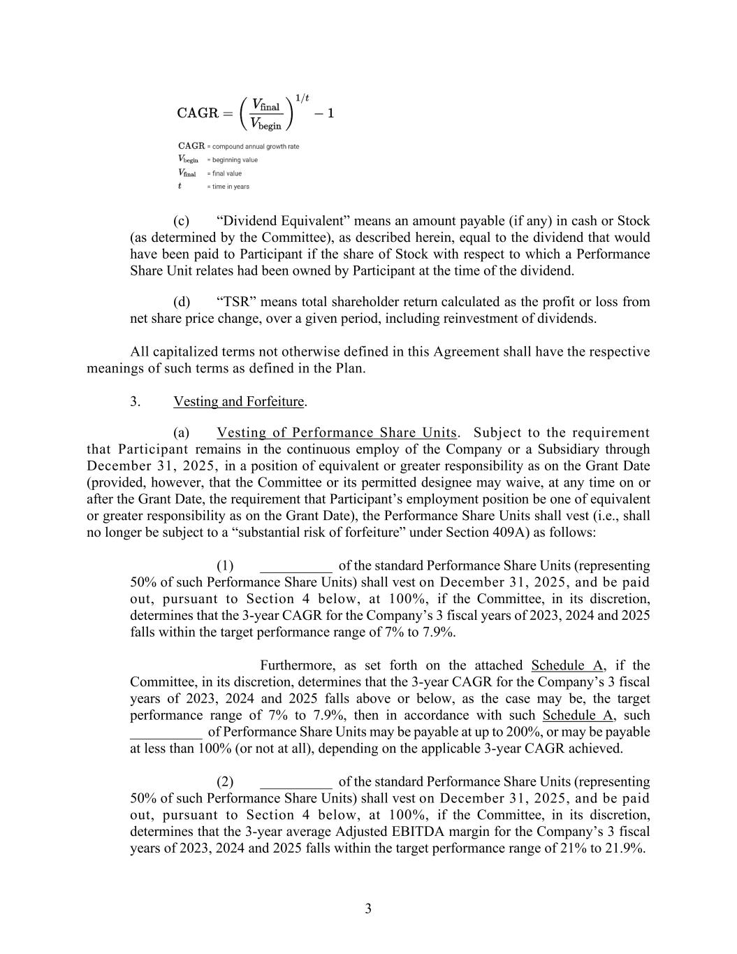 3 (c) “Dividend Equivalent” means an amount payable (if any) in cash or Stock (as determined by the Committee), as described herein, equal to the dividend that would have been paid to Participant if the share of Stock with respect to which a Performance Share Unit relates had been owned by Participant at the time of the dividend. (d) “TSR” means total shareholder return calculated as the profit or loss from net share price change, over a given period, including reinvestment of dividends. All capitalized terms not otherwise defined in this Agreement shall have the respective meanings of such terms as defined in the Plan. 3. Vesting and Forfeiture. (a) Vesting of Performance Share Units. Subject to the requirement that Participant remains in the continuous employ of the Company or a Subsidiary through December 31, 2025, in a position of equivalent or greater responsibility as on the Grant Date (provided, however, that the Committee or its permitted designee may waive, at any time on or after the Grant Date, the requirement that Participant’s employment position be one of equivalent or greater responsibility as on the Grant Date), the Performance Share Units shall vest (i.e., shall no longer be subject to a “substantial risk of forfeiture” under Section 409A) as follows: (1) __________ of the standard Performance Share Units (representing 50% of such Performance Share Units) shall vest on December 31, 2025, and be paid out, pursuant to Section 4 below, at 100%, if the Committee, in its discretion, determines that the 3-year CAGR for the Company’s 3 fiscal years of 2023, 2024 and 2025 falls within the target performance range of 7% to 7.9%. Furthermore, as set forth on the attached Schedule A, if the Committee, in its discretion, determines that the 3-year CAGR for the Company’s 3 fiscal years of 2023, 2024 and 2025 falls above or below, as the case may be, the target performance range of 7% to 7.9%, then in accordance with such Schedule A, such __________ of Performance Share Units may be payable at up to 200%, or may be payable at less than 100% (or not at all), depending on the applicable 3-year CAGR achieved. (2) __________ of the standard Performance Share Units (representing 50% of such Performance Share Units) shall vest on December 31, 2025, and be paid out, pursuant to Section 4 below, at 100%, if the Committee, in its discretion, determines that the 3-year average Adjusted EBITDA margin for the Company’s 3 fiscal years of 2023, 2024 and 2025 falls within the target performance range of 21% to 21.9%.