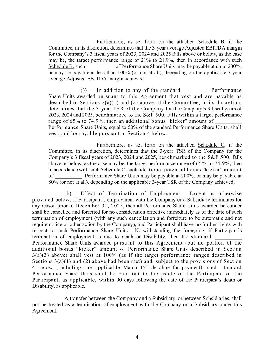 4 Furthermore, as set forth on the attached Schedule B, if the Committee, in its discretion, determines that the 3-year average Adjusted EBITDA margin for the Company’s 3 fiscal years of 2023, 2024 and 2025 falls above or below, as the case may be, the target performance range of 21% to 21.9%, then in accordance with such Schedule B, such __________ of Performance Share Units may be payable at up to 200%, or may be payable at less than 100% (or not at all), depending on the applicable 3-year average Adjusted EBITDA margin achieved. (3) In addition to any of the standard __________ Performance Share Units awarded pursuant to this Agreement that vest and are payable as described in Sections 2(a)(1) and (2) above, if the Committee, in its discretion, determines that the 3-year TSR of the Company for the Company’s 3 fiscal years of 2023, 2024 and 2025, benchmarked to the S&P 500, falls within a target performance range of 65% to 74.9%, then an additional bonus “kicker” amount of __________ Performance Share Units, equal to 50% of the standard Performance Share Units, shall vest, and be payable pursuant to Section 4 below. Furthermore, as set forth on the attached Schedule C, if the Committee, in its discretion, determines that the 3-year TSR of the Company for the Company’s 3 fiscal years of 2023, 2024 and 2025, benchmarked to the S&P 500, falls above or below, as the case may be, the target performance range of 65% to 74.9%, then in accordance with such Schedule C, such additional potential bonus “kicker” amount of __________ Performance Share Units may be payable at 200%, or may be payable at 80% (or not at all), depending on the applicable 3-year TSR of the Company achieved. (b) Effect of Termination of Employment. Except as otherwise provided below, if Participant’s employment with the Company or a Subsidiary terminates for any reason prior to December 31, 2025, then all Performance Share Units awarded hereunder shall be cancelled and forfeited for no consideration effective immediately as of the date of such termination of employment (with any such cancellation and forfeiture to be automatic and not require notice or other action by the Company), and Participant shall have no further rights with respect to such Performance Share Units. Notwithstanding the foregoing, if Participant’s termination of employment is due to death or Disability, then the standard __________ Performance Share Units awarded pursuant to this Agreement (but no portion of the additional bonus “kicker” amount of Performance Share Units described in Section 3(a)(3) above) shall vest at 100% (as if the target performance ranges described in Sections 3(a)(1) and (2) above had been met) and, subject to the provisions of Section 4 below (including the applicable March 15th deadline for payment), such standard Performance Share Units shall be paid out to the estate of the Participant or the Participant, as applicable, within 90 days following the date of the Participant’s death or Disability, as applicable. A transfer between the Company and a Subsidiary, or between Subsidiaries, shall not be treated as a termination of employment with the Company or a Subsidiary under this Agreement.