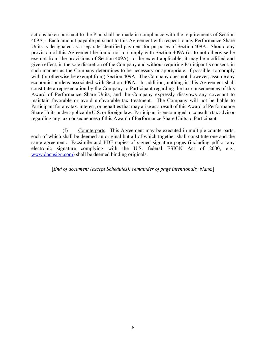 6 actions taken pursuant to the Plan shall be made in compliance with the requirements of Section 409A). Each amount payable pursuant to this Agreement with respect to any Performance Share Units is designated as a separate identified payment for purposes of Section 409A. Should any provision of this Agreement be found not to comply with Section 409A (or to not otherwise be exempt from the provisions of Section 409A), to the extent applicable, it may be modified and given effect, in the sole discretion of the Company and without requiring Participant’s consent, in such manner as the Company determines to be necessary or appropriate, if possible, to comply with (or otherwise be exempt from) Section 409A. The Company does not, however, assume any economic burdens associated with Section 409A. In addition, nothing in this Agreement shall constitute a representation by the Company to Participant regarding the tax consequences of this Award of Performance Share Units, and the Company expressly disavows any covenant to maintain favorable or avoid unfavorable tax treatment. The Company will not be liable to Participant for any tax, interest, or penalties that may arise as a result of this Award of Performance Share Units under applicable U.S. or foreign law. Participant is encouraged to consult a tax advisor regarding any tax consequences of this Award of Performance Share Units to Participant. (f) Counterparts. This Agreement may be executed in multiple counterparts, each of which shall be deemed an original but all of which together shall constitute one and the same agreement. Facsimile and PDF copies of signed signature pages (including pdf or any electronic signature complying with the U.S. federal ESIGN Act of 2000, e.g., www.docusign.com) shall be deemed binding originals. [End of document (except Schedules); remainder of page intentionally blank.]