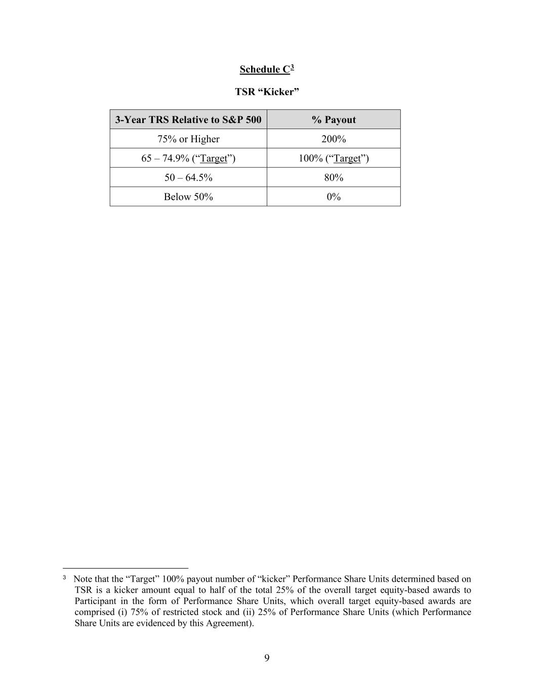 8 Schedule B2 Adjusted EBITDA Margin 3-Year Avg. Adjusted EBITDA Margin % Payout 24% or Higher 200% 23 – 23.9% 180% 22 – 22.9% 140% 21 – 21.9% (“Target”) 100% (“Target”) 20 – 20.9% 60% 19 – 19.9% 20% Below 19% 0% 2 Note that the “Target” 100% payout number of Performance Share Units determined based on Adjusted EBITDA margin represents half of the total 25% of the overall target equity-based awards to Participant in the form of Performance Share Units, which overall target equity-based awards are comprised (i) 75% of restricted stock and (ii) 25% of Performance Share Units (which Performance Share Units are evidenced by this Agreement).