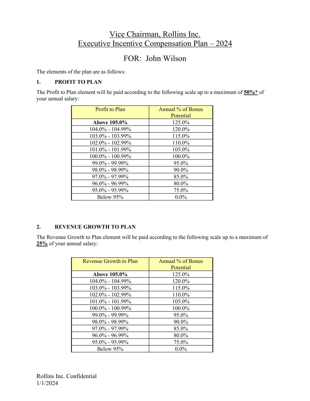 Rollins Inc. Confidential 1/1/2024 Vice Chairman, Rollins Inc. Executive Incentive Compensation Plan – 2024 FOR: John Wilson The elements of the plan are as follows: 1. PROFIT TO PLAN The Profit to Plan element will be paid according to the following scale up to a maximum of 50%* of your annual salary: Profit to Plan Annual % of Bonus Potential Above 105.0% 125.0% 104.0% - 104.99% 120.0% 103.0% - 103.99% 115.0% 102.0% - 102.99% 110.0% 101.0% - 101.99% 105.0% 100.0% - 100.99% 100.0% 99.0% - 99.99% 95.0% 98.0% - 98.99% 90.0% 97.0% - 97.99% 85.0% 96.0% - 96.99% 80.0% 95.0% - 95.99% 75.0% Below 95% 0.0% 2. REVENUE GROWTH TO PLAN The Revenue Growth to Plan element will be paid according to the following scale up to a maximum of 25% of your annual salary: Revenue Growth to Plan Annual % of Bonus Potential Above 105.0% 125.0% 104.0% - 104.99% 120.0% 103.0% - 103.99% 115.0% 102.0% - 102.99% 110.0% 101.0% - 101.99% 105.0% 100.0% - 100.99% 100.0% 99.0% - 99.99% 95.0% 98.0% - 98.99% 90.0% 97.0% - 97.99% 85.0% 96.0% - 96.99% 80.0% 95.0% - 95.99% 75.0% Below 95% 0.0%