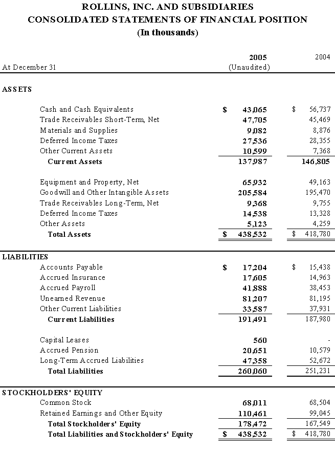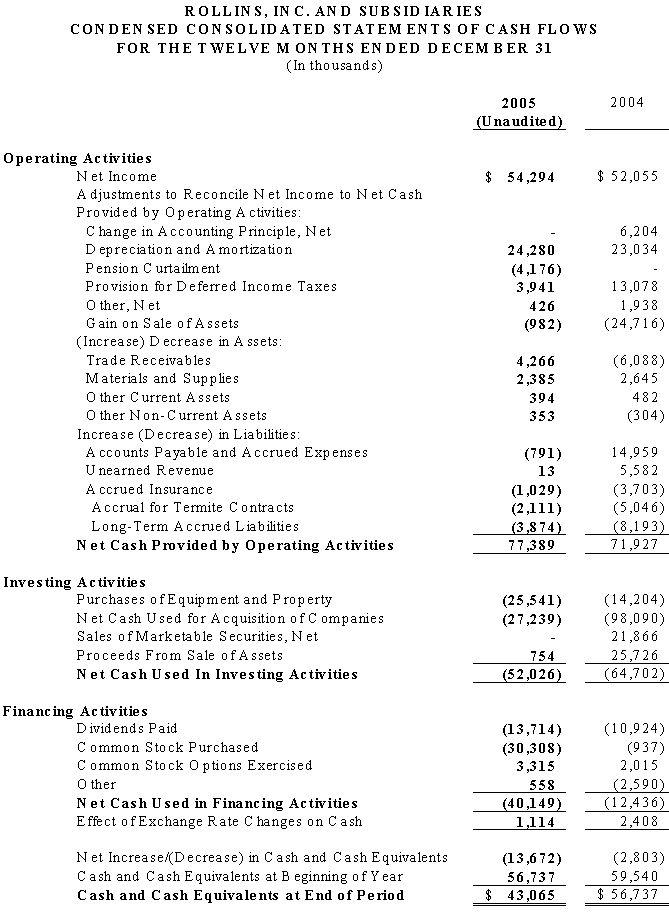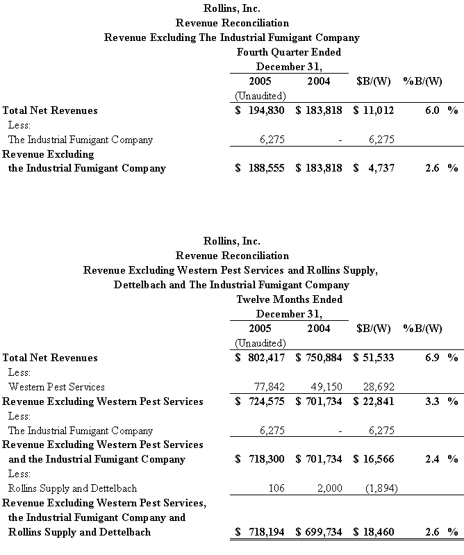 Mr. Rollins concluded, We recognize that there is much to be done in 2006 as we make major investments in our businesses in order to gain more customers and provide them with ever improving pest and termite control services. In 2005 we began several initiatives that will accelerate and help us achieve these goals. As an example this year we will be adding approximately 100 new sales persons over the course of the year. We are optimistic about Rollins prospects and look forward to reporting to you on our progress throughout the year.