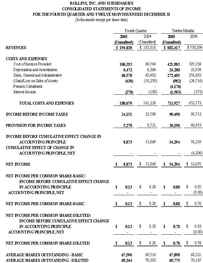 ATLANTA, GEORGIA, February 15, 2006: Rollins, Inc. (NYSE:ROL), a premier North American consumer and commercial services company, today reported revenues for the fourth quarter ended December 31, 2005 grew 6.0% to $194.8 million compared to $183.8 million for the fourth quarter ended December 31, 2004.