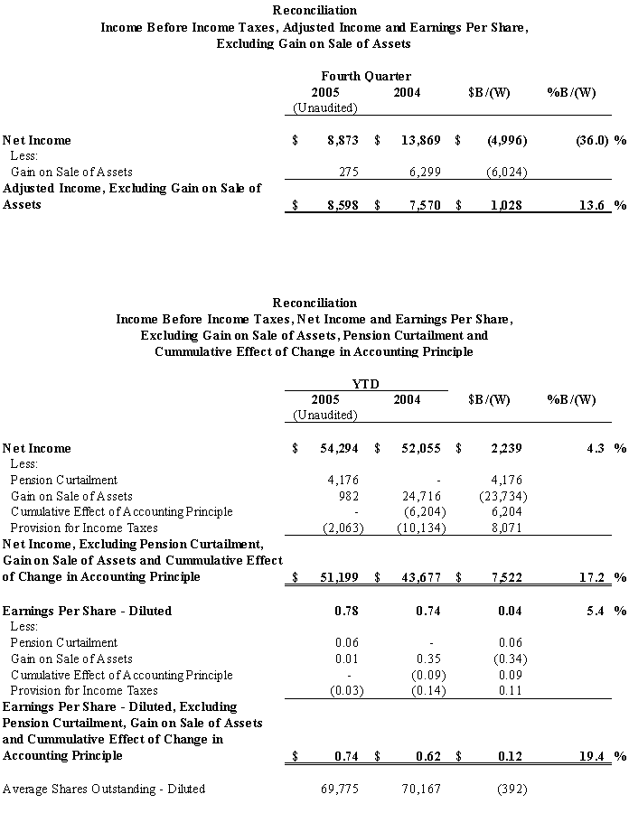 The Company recorded net income of $8.9 million or $0.13 per diluted share for the fourth quarter ended December 31, 2005, compared to $13.9 million or $0.20 per diluted share for the fourth quarter ended December 31, 2004. Net income for the fourth quarter of 2004 included gains from the sale of assets, net of taxes, of $6.3 million or $0.09 per diluted share. Adjusted income for fourth quarter 2005 excluding gain on sale of assets was $8.6 million, compared to $7.6 million for fourth quarter 2004, a 13.6% increase.