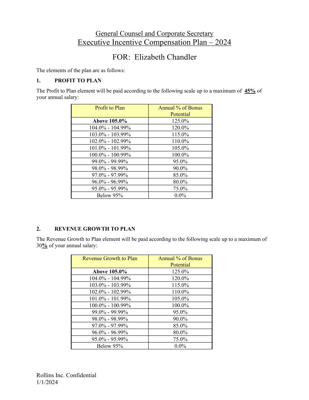 Rollins Inc. Confidential 1/1/2024 General Counsel and Corporate Secretary Executive Incentive Compensation Plan – 2024 FOR: Elizabeth Chandler The elements of the plan are as follows: 1. PROFIT TO PLAN The Profit to Plan element will be paid according to the following scale up to a maximum of 45% of your annual salary: Profit to Plan Annual % of Bonus Potential Above 105.0% 125.0% 104.0% - 104.99% 120.0% 103.0% - 103.99% 115.0% 102.0% - 102.99% 110.0% 101.0% - 101.99% 105.0% 100.0% - 100.99% 100.0% 99.0% - 99.99% 95.0% 98.0% - 98.99% 90.0% 97.0% - 97.99% 85.0% 96.0% - 96.99% 80.0% 95.0% - 95.99% 75.0% Below 95% 0.0% 2. REVENUE GROWTH TO PLAN The Revenue Growth to Plan element will be paid according to the following scale up to a maximum of 30% of your annual salary: Revenue Growth to Plan Annual % of Bonus Potential Above 105.0% 125.0% 104.0% - 104.99% 120.0% 103.0% - 103.99% 115.0% 102.0% - 102.99% 110.0% 101.0% - 101.99% 105.0% 100.0% - 100.99% 100.0% 99.0% - 99.99% 95.0% 98.0% - 98.99% 90.0% 97.0% - 97.99% 85.0% 96.0% - 96.99% 80.0% 95.0% - 95.99% 75.0% Below 95% 0.0%