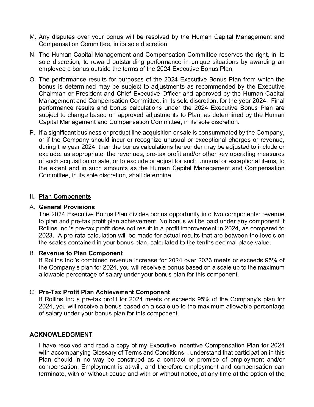 M. Any disputes over your bonus will be resolved by the Human Capital Management and Compensation Committee, in its sole discretion. N. The Human Capital Management and Compensation Committee reserves the right, in its sole discretion, to reward outstanding performance in unique situations by awarding an employee a bonus outside the terms of the 2024 Executive Bonus Plan. O. The performance results for purposes of the 2024 Executive Bonus Plan from which the bonus is determined may be subject to adjustments as recommended by the Executive Chairman or President and Chief Executive Officer and approved by the Human Capital Management and Compensation Committee, in its sole discretion, for the year 2024. Final performance results and bonus calculations under the 2024 Executive Bonus Plan are subject to change based on approved adjustments to Plan, as determined by the Human Capital Management and Compensation Committee, in its sole discretion. P. If a significant business or product line acquisition or sale is consummated by the Company, or if the Company should incur or recognize unusual or exceptional charges or revenue, during the year 2024, then the bonus calculations hereunder may be adjusted to include or exclude, as appropriate, the revenues, pre-tax profit and/or other key operating measures of such acquisition or sale, or to exclude or adjust for such unusual or exceptional items, to the extent and in such amounts as the Human Capital Management and Compensation Committee, in its sole discretion, shall determine. II. Plan Components A. General Provisions The 2024 Executive Bonus Plan divides bonus opportunity into two components: revenue to plan and pre-tax profit plan achievement. No bonus will be paid under any component if Rollins Inc.’s pre-tax profit does not result in a profit improvement in 2024, as compared to 2023. A pro-rata calculation will be made for actual results that are between the levels on the scales contained in your bonus plan, calculated to the tenths decimal place value. B. Revenue to Plan Component If Rollins Inc.’s combined revenue increase for 2024 over 2023 meets or exceeds 95% of the Company’s plan for 2024, you will receive a bonus based on a scale up to the maximum allowable percentage of salary under your bonus plan for this component. C. Pre-Tax Profit Plan Achievement Component If Rollins Inc.’s pre-tax profit for 2024 meets or exceeds 95% of the Company’s plan for 2024, you will receive a bonus based on a scale up to the maximum allowable percentage of salary under your bonus plan for this component. ACKNOWLEDGMENT I have received and read a copy of my Executive Incentive Compensation Plan for 2024 with accompanying Glossary of Terms and Conditions. I understand that participation in this Plan should in no way be construed as a contract or promise of employment and/or compensation. Employment is at-will, and therefore employment and compensation can terminate, with or without cause and with or without notice, at any time at the option of the