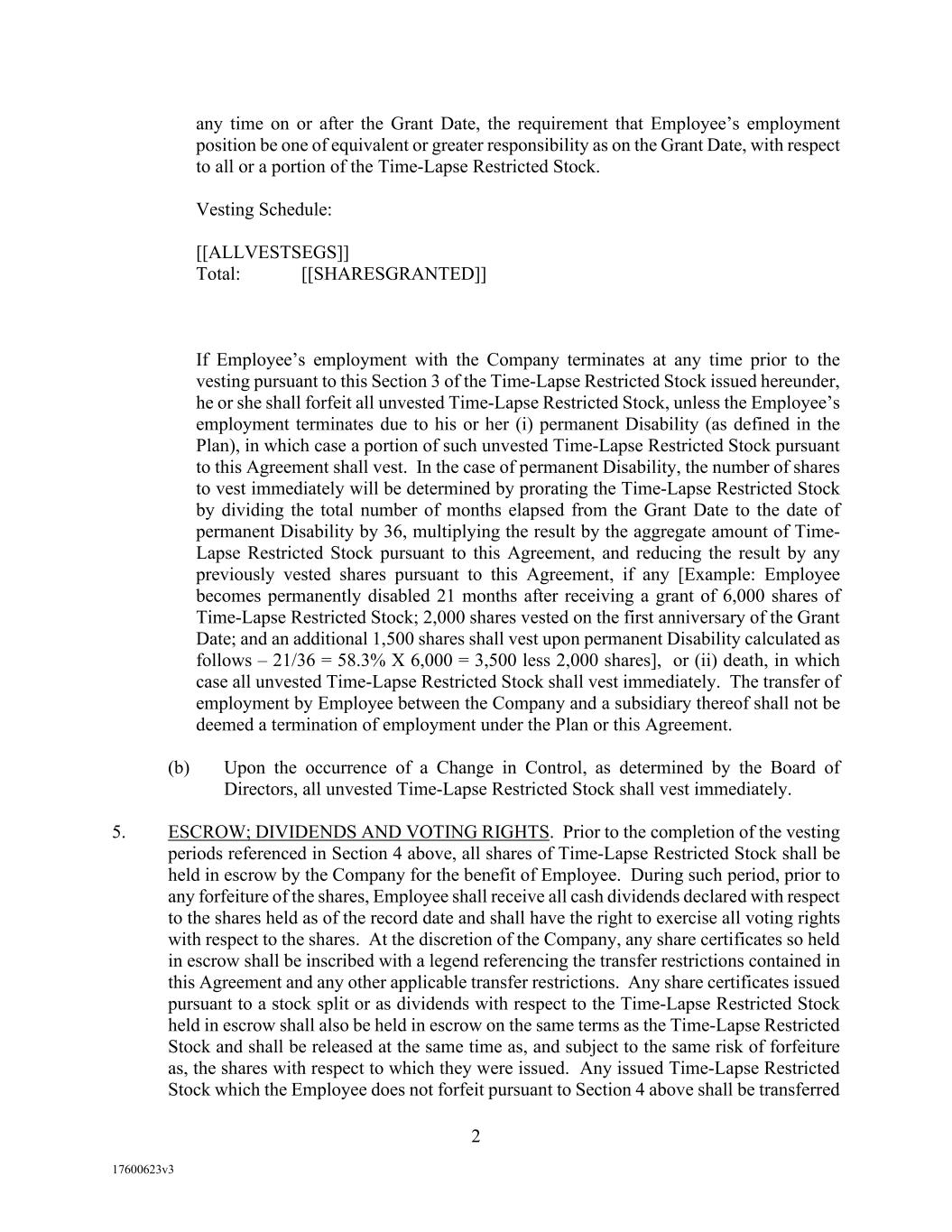 2 17600623v3 any time on or after the Grant Date, the requirement that Employee’s employment position be one of equivalent or greater responsibility as on the Grant Date, with respect to all or a portion of the Time-Lapse Restricted Stock. Vesting Schedule: [[ALLVESTSEGS]] Total: [[SHARESGRANTED]] If Employee’s employment with the Company terminates at any time prior to the vesting pursuant to this Section 3 of the Time-Lapse Restricted Stock issued hereunder, he or she shall forfeit all unvested Time-Lapse Restricted Stock, unless the Employee’s employment terminates due to his or her (i) permanent Disability (as defined in the Plan), in which case a portion of such unvested Time-Lapse Restricted Stock pursuant to this Agreement shall vest. In the case of permanent Disability, the number of shares to vest immediately will be determined by prorating the Time-Lapse Restricted Stock by dividing the total number of months elapsed from the Grant Date to the date of permanent Disability by 36, multiplying the result by the aggregate amount of Time- Lapse Restricted Stock pursuant to this Agreement, and reducing the result by any previously vested shares pursuant to this Agreement, if any [Example: Employee becomes permanently disabled 21 months after receiving a grant of 6,000 shares of Time-Lapse Restricted Stock; 2,000 shares vested on the first anniversary of the Grant Date; and an additional 1,500 shares shall vest upon permanent Disability calculated as follows – 21/36 = 58.3% X 6,000 = 3,500 less 2,000 shares], or (ii) death, in which case all unvested Time-Lapse Restricted Stock shall vest immediately. The transfer of employment by Employee between the Company and a subsidiary thereof shall not be deemed a termination of employment under the Plan or this Agreement. (b) Upon the occurrence of a Change in Control, as determined by the Board of Directors, all unvested Time-Lapse Restricted Stock shall vest immediately. 5. ESCROW; DIVIDENDS AND VOTING RIGHTS. Prior to the completion of the vesting periods referenced in Section 4 above, all shares of Time-Lapse Restricted Stock shall be held in escrow by the Company for the benefit of Employee. During such period, prior to any forfeiture of the shares, Employee shall receive all cash dividends declared with respect to the shares held as of the record date and shall have the right to exercise all voting rights with respect to the shares. At the discretion of the Company, any share certificates so held in escrow shall be inscribed with a legend referencing the transfer restrictions contained in this Agreement and any other applicable transfer restrictions. Any share certificates issued pursuant to a stock split or as dividends with respect to the Time-Lapse Restricted Stock held in escrow shall also be held in escrow on the same terms as the Time-Lapse Restricted Stock and shall be released at the same time as, and subject to the same risk of forfeiture as, the shares with respect to which they were issued. Any issued Time-Lapse Restricted Stock which the Employee does not forfeit pursuant to Section 4 above shall be transferred