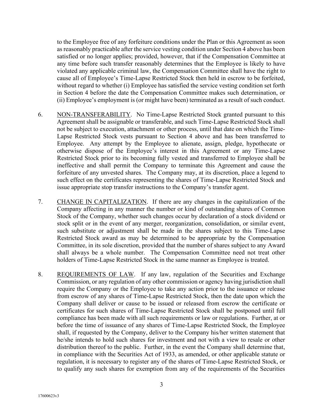 3 17600623v3 to the Employee free of any forfeiture conditions under the Plan or this Agreement as soon as reasonably practicable after the service vesting condition under Section 4 above has been satisfied or no longer applies; provided, however, that if the Compensation Committee at any time before such transfer reasonably determines that the Employee is likely to have violated any applicable criminal law, the Compensation Committee shall have the right to cause all of Employee’s Time-Lapse Restricted Stock then held in escrow to be forfeited, without regard to whether (i) Employee has satisfied the service vesting condition set forth in Section 4 before the date the Compensation Committee makes such determination, or (ii) Employee’s employment is (or might have been) terminated as a result of such conduct. 6. NON-TRANSFERABILITY. No Time-Lapse Restricted Stock granted pursuant to this Agreement shall be assignable or transferable, and such Time-Lapse Restricted Stock shall not be subject to execution, attachment or other process, until that date on which the Time- Lapse Restricted Stock vests pursuant to Section 4 above and has been transferred to Employee. Any attempt by the Employee to alienate, assign, pledge, hypothecate or otherwise dispose of the Employee’s interest in this Agreement or any Time-Lapse Restricted Stock prior to its becoming fully vested and transferred to Employee shall be ineffective and shall permit the Company to terminate this Agreement and cause the forfeiture of any unvested shares. The Company may, at its discretion, place a legend to such effect on the certificates representing the shares of Time-Lapse Restricted Stock and issue appropriate stop transfer instructions to the Company’s transfer agent. 7. CHANGE IN CAPITALIZATION. If there are any changes in the capitalization of the Company affecting in any manner the number or kind of outstanding shares of Common Stock of the Company, whether such changes occur by declaration of a stock dividend or stock split or in the event of any merger, reorganization, consolidation, or similar event, such substitute or adjustment shall be made in the shares subject to this Time-Lapse Restricted Stock award as may be determined to be appropriate by the Compensation Committee, in its sole discretion, provided that the number of shares subject to any Award shall always be a whole number. The Compensation Committee need not treat other holders of Time-Lapse Restricted Stock in the same manner as Employee is treated. 8. REQUIREMENTS OF LAW. If any law, regulation of the Securities and Exchange Commission, or any regulation of any other commission or agency having jurisdiction shall require the Company or the Employee to take any action prior to the issuance or release from escrow of any shares of Time-Lapse Restricted Stock, then the date upon which the Company shall deliver or cause to be issued or released from escrow the certificate or certificates for such shares of Time-Lapse Restricted Stock shall be postponed until full compliance has been made with all such requirements or law or regulations. Further, at or before the time of issuance of any shares of Time-Lapse Restricted Stock, the Employee shall, if requested by the Company, deliver to the Company his/her written statement that he/she intends to hold such shares for investment and not with a view to resale or other distribution thereof to the public. Further, in the event the Company shall determine that, in compliance with the Securities Act of 1933, as amended, or other applicable statute or regulation, it is necessary to register any of the shares of Time-Lapse Restricted Stock, or to qualify any such shares for exemption from any of the requirements of the Securities