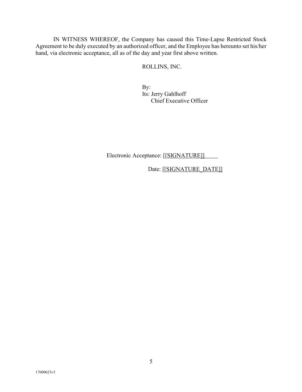 5 17600623v3 IN WITNESS WHEREOF, the Company has caused this Time-Lapse Restricted Stock Agreement to be duly executed by an authorized officer, and the Employee has hereunto set his/her hand, via electronic acceptance, all as of the day and year first above written. ROLLINS, INC. By: Its: Jerry Gahlhoff Chief Executive Officer Electronic Acceptance: [[SIGNATURE]] Date: [[SIGNATURE_DATE]]