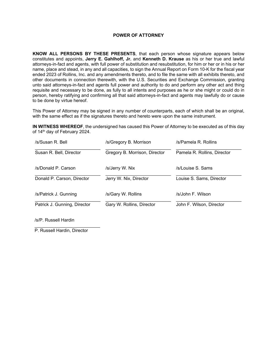 POWER OF ATTORNEY KNOW ALL PERSONS BY THESE PRESENTS, that each person whose signature appears below constitutes and appoints, Jerry E. Gahlhoff, Jr. and Kenneth D. Krause as his or her true and lawful attorneys-in-fact and agents, with full power of substitution and resubstitution, for him or her or in his or her name, place and stead, in any and all capacities, to sign the Annual Report on Form 10-K for the fiscal year ended 2023 of Rollins, Inc. and any amendments thereto, and to file the same with all exhibits thereto, and other documents in connection therewith, with the U.S. Securities and Exchange Commission, granting unto said attorneys-in-fact and agents full power and authority to do and perform any other act and thing requisite and necessary to be done, as fully to all intents and purposes as he or she might or could do in person, hereby ratifying and confirming all that said attorneys-in-fact and agents may lawfully do or cause to be done by virtue hereof. This Power of Attorney may be signed in any number of counterparts, each of which shall be an original, with the same effect as if the signatures thereto and hereto were upon the same instrument. IN WITNESS WHEREOF, the undersigned has caused this Power of Attorney to be executed as of this day of 14th day of February 2024. /s/Susan R. Bell __________________________ Susan R. Bell, Director /s/Gregory B. Morrison __________________________ Gregory B. Morrison, Director /s/Pamela R. Rollins __________________________ Pamela R. Rollins, Director /s/Donald P. Carson __________________________ Donald P. Carson, Director /s/Jerry W. Nix __________________________ Jerry W. Nix, Director /s/Louise S. Sams __________________________ Louise S. Sams, Director /s/Patrick J. Gunning __________________________ Patrick J. Gunning, Director /s/Gary W. Rollins __________________________ Gary W. Rollins, Director /s/John F. Wilson __________________________ John F. Wilson, Director /s/P. Russell Hardin __________________________ P. Russell Hardin, Director