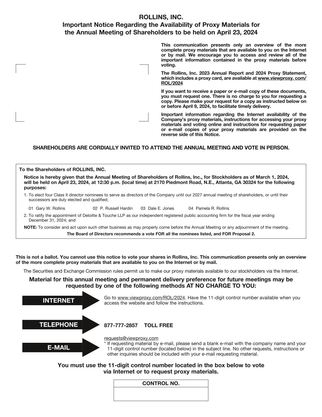 To the Shareholders of ROLLINS, INC. Notice is hereby given that the Annual Meeting of Shareholders of Rollins, Inc., for Stockholders as of March 1, 2024, will be held on April 23, 2024, at 12:30 p.m. (local time) at 2170 Piedmont Road, N.E., Atlanta, GA 30324 for the following purposes: 1. To elect four Class II director nominees to serve as directors of the Company until our 2027 annual meeting of shareholders, or until their successors are duly elected and qualified; 01 Gary W. Rollins 02 P. Russell Hardin 03 Dale E. Jones 04 Pamela R. Rollins 2. To ratify the appointment of Deloitte & Touche LLP as our independent registered public accounting firm for the fiscal year ending December 31, 2024; and NOTE: To consider and act upon such other business as may properly come before the Annual Meeting or any adjournment of the meeting. The Board of Directors recommends a vote FOR all the nominees listed, and FOR Proposal 2. ROLLINS, INC. Important Notice Regarding the Availability of Proxy Materials for the Annual Meeting of Shareholders to be held on April 23, 2024 This communication presents only an overview of the more complete proxy materials that are available to you on the Internet or by mail. We encourage you to access and review all of the important information contained in the proxy materials before voting. The Rollins, Inc. 2023 Annual Report and 2024 Proxy Statement, which includes a proxy card, are available at www.viewproxy. com/ ROL/2024 If you want to receive a paper or e-mail copy of these documents, you must request one. There is no charge to you for requesting a copy. Please make your request for a copy as instructed below on or before April 9, 2024, to facilitate timely delivery. Important information regarding the Internet availability of the Company’s proxy materials, instructions for accessing your proxy materials and voting online and instructions for requesting paper or e-mail copies of your proxy materials are provided on the reverse side of this Notice. SHAREHOLDERS ARE CORDIALLY INVITED TO ATTEND THE ANNUAL MEETING AND VOTE IN PERSON. INTERNET TELEPHONE E-MAIL The Securities and Exchange Commission rules permit us to make our proxy materials available to our stockholders via the Internet. Material for this annual meeting and permanent delivery preference for future meetings may be requested by one of the following methods AT NO CHARGE TO YOU: Go to www.viewproxy.com/ROL/2024. Have the 11-digit control number available when you access the website and follow the instructions. 877-777-2857 TOLL FREE requests@viewproxy.com * If requesting material by e-mail, please send a blank e-mail with the company name and your 11-digit control number (located below) in the subject line. No other requests, instructions or other inquiries should be included with your e-mail requesting material. You must use the 11-digit control number located in the box below to vote via Internet or to request proxy materials. This is not a ballot. You cannot use this notice to vote your shares in Rollins, Inc. This communication presents only an overview of the more complete proxy materials that are available to you on the Internet or by mail. CONTROL NO.