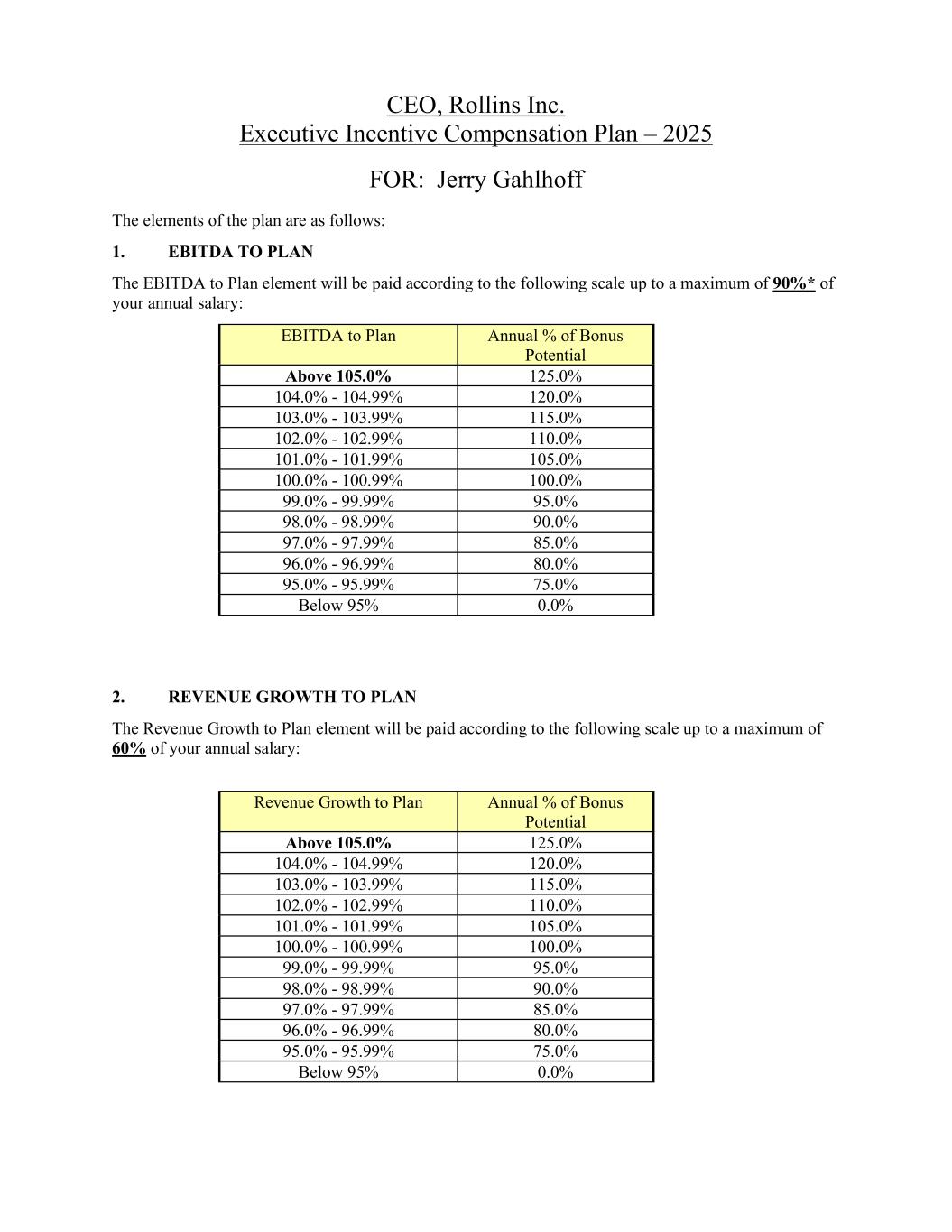 CEO, Rollins Inc. Executive Incentive Compensation Plan – 2025 FOR: Jerry Gahlhoff The elements of the plan are as follows: 1. EBITDA TO PLAN The EBITDA to Plan element will be paid according to the following scale up to a maximum of 90%* of your annual salary: EBITDA to Plan Annual % of Bonus Potential Above 105.0% 125.0% 104.0% - 104.99% 120.0% 103.0% - 103.99% 115.0% 102.0% - 102.99% 110.0% 101.0% - 101.99% 105.0% 100.0% - 100.99% 100.0% 99.0% - 99.99% 95.0% 98.0% - 98.99% 90.0% 97.0% - 97.99% 85.0% 96.0% - 96.99% 80.0% 95.0% - 95.99% 75.0% Below 95% 0.0% 2. REVENUE GROWTH TO PLAN The Revenue Growth to Plan element will be paid according to the following scale up to a maximum of 60% of your annual salary: Revenue Growth to Plan Annual % of Bonus Potential Above 105.0% 125.0% 104.0% - 104.99% 120.0% 103.0% - 103.99% 115.0% 102.0% - 102.99% 110.0% 101.0% - 101.99% 105.0% 100.0% - 100.99% 100.0% 99.0% - 99.99% 95.0% 98.0% - 98.99% 90.0% 97.0% - 97.99% 85.0% 96.0% - 96.99% 80.0% 95.0% - 95.99% 75.0% Below 95% 0.0%