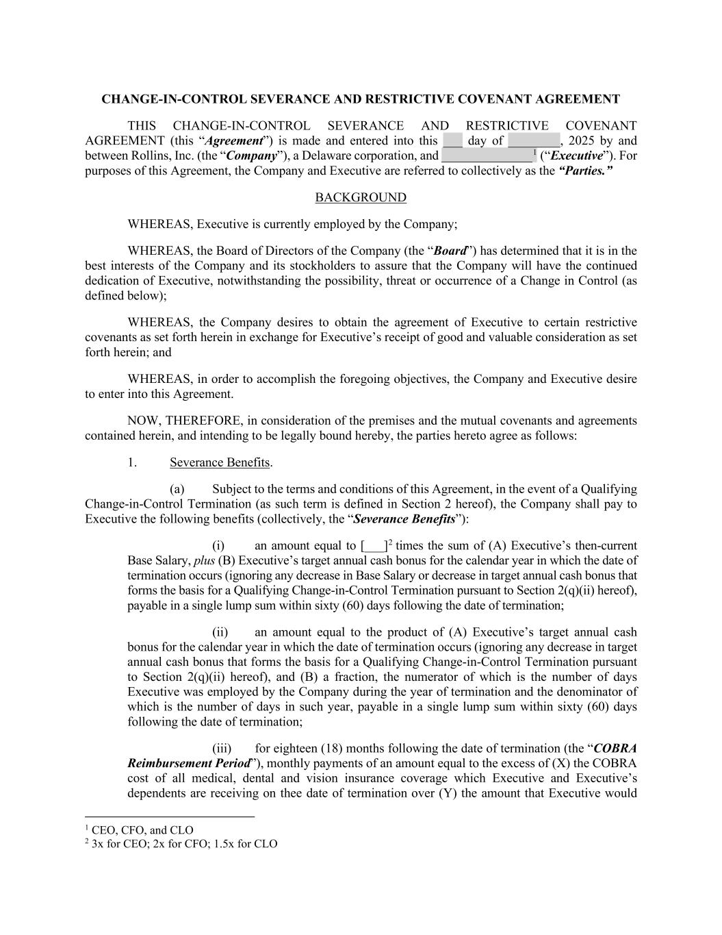 CHANGE-IN-CONTROL SEVERANCE AND RESTRICTIVE COVENANT AGREEMENT THIS CHANGE-IN-CONTROL SEVERANCE AND RESTRICTIVE COVENANT AGREEMENT (this “Agreement”) is made and entered into this ___ day of ________, 2025 by and between Rollins, Inc. (the “Company”), a Delaware corporation, and ______________1 (“Executive”). For purposes of this Agreement, the Company and Executive are referred to collectively as the “Parties.” BACKGROUND WHEREAS, Executive is currently employed by the Company; WHEREAS, the Board of Directors of the Company (the “Board”) has determined that it is in the best interests of the Company and its stockholders to assure that the Company will have the continued dedication of Executive, notwithstanding the possibility, threat or occurrence of a Change in Control (as defined below); WHEREAS, the Company desires to obtain the agreement of Executive to certain restrictive covenants as set forth herein in exchange for Executive’s receipt of good and valuable consideration as set forth herein; and WHEREAS, in order to accomplish the foregoing objectives, the Company and Executive desire to enter into this Agreement. NOW, THEREFORE, in consideration of the premises and the mutual covenants and agreements contained herein, and intending to be legally bound hereby, the parties hereto agree as follows: 1. Severance Benefits. (a) Subject to the terms and conditions of this Agreement, in the event of a Qualifying Change-in-Control Termination (as such term is defined in Section 2 hereof), the Company shall pay to Executive the following benefits (collectively, the “Severance Benefits”): (i) an amount equal to [___]2 times the sum of (A) Executive’s then-current Base Salary, plus (B) Executive’s target annual cash bonus for the calendar year in which the date of termination occurs (ignoring any decrease in Base Salary or decrease in target annual cash bonus that forms the basis for a Qualifying Change-in-Control Termination pursuant to Section 2(q)(ii) hereof), payable in a single lump sum within sixty (60) days following the date of termination; (ii) an amount equal to the product of (A) Executive’s target annual cash bonus for the calendar year in which the date of termination occurs (ignoring any decrease in target annual cash bonus that forms the basis for a Qualifying Change-in-Control Termination pursuant to Section 2(q)(ii) hereof), and (B) a fraction, the numerator of which is the number of days Executive was employed by the Company during the year of termination and the denominator of which is the number of days in such year, payable in a single lump sum within sixty (60) days following the date of termination; (iii) for eighteen (18) months following the date of termination (the “COBRA Reimbursement Period”), monthly payments of an amount equal to the excess of (X) the COBRA cost of all medical, dental and vision insurance coverage which Executive and Executive’s dependents are receiving on thee date of termination over (Y) the amount that Executive would 1 CEO, CFO, and CLO 2 3x for CEO; 2x for CFO; 1.5x for CLO
