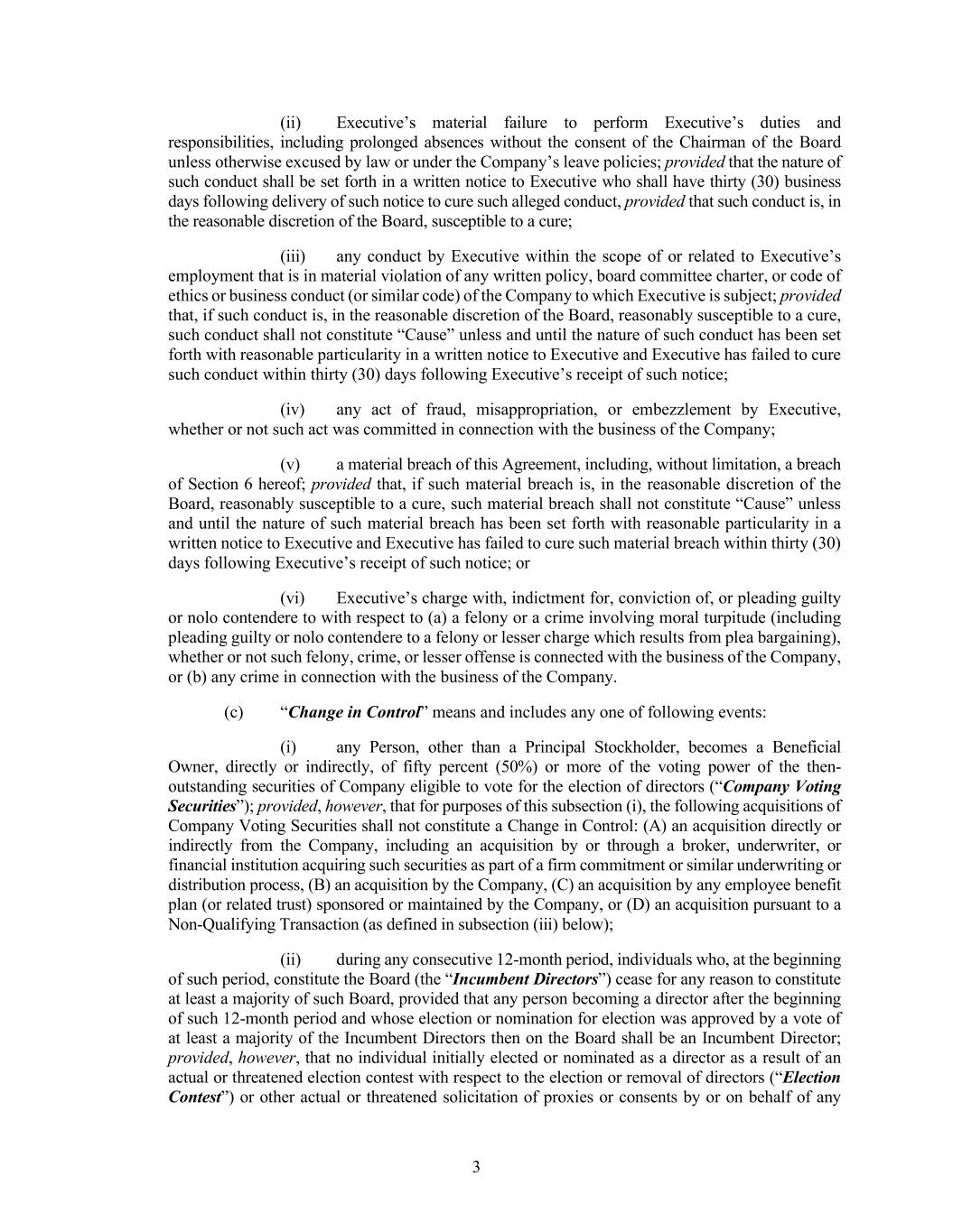 3 (ii) Executive’s material failure to perform Executive’s duties and responsibilities, including prolonged absences without the consent of the Chairman of the Board unless otherwise excused by law or under the Company’s leave policies; provided that the nature of such conduct shall be set forth in a written notice to Executive who shall have thirty (30) business days following delivery of such notice to cure such alleged conduct, provided that such conduct is, in the reasonable discretion of the Board, susceptible to a cure; (iii) any conduct by Executive within the scope of or related to Executive’s employment that is in material violation of any written policy, board committee charter, or code of ethics or business conduct (or similar code) of the Company to which Executive is subject; provided that, if such conduct is, in the reasonable discretion of the Board, reasonably susceptible to a cure, such conduct shall not constitute “Cause” unless and until the nature of such conduct has been set forth with reasonable particularity in a written notice to Executive and Executive has failed to cure such conduct within thirty (30) days following Executive’s receipt of such notice; (iv) any act of fraud, misappropriation, or embezzlement by Executive, whether or not such act was committed in connection with the business of the Company; (v) a material breach of this Agreement, including, without limitation, a breach of Section 6 hereof; provided that, if such material breach is, in the reasonable discretion of the Board, reasonably susceptible to a cure, such material breach shall not constitute “Cause” unless and until the nature of such material breach has been set forth with reasonable particularity in a written notice to Executive and Executive has failed to cure such material breach within thirty (30) days following Executive’s receipt of such notice; or (vi) Executive’s charge with, indictment for, conviction of, or pleading guilty or nolo contendere to with respect to (a) a felony or a crime involving moral turpitude (including pleading guilty or nolo contendere to a felony or lesser charge which results from plea bargaining), whether or not such felony, crime, or lesser offense is connected with the business of the Company, or (b) any crime in connection with the business of the Company. (c) “Change in Control” means and includes any one of following events: (i) any Person, other than a Principal Stockholder, becomes a Beneficial Owner, directly or indirectly, of fifty percent (50%) or more of the voting power of the then- outstanding securities of Company eligible to vote for the election of directors (“Company Voting Securities”); provided, however, that for purposes of this subsection (i), the following acquisitions of Company Voting Securities shall not constitute a Change in Control: (A) an acquisition directly or indirectly from the Company, including an acquisition by or through a broker, underwriter, or financial institution acquiring such securities as part of a firm commitment or similar underwriting or distribution process, (B) an acquisition by the Company, (C) an acquisition by any employee benefit plan (or related trust) sponsored or maintained by the Company, or (D) an acquisition pursuant to a Non-Qualifying Transaction (as defined in subsection (iii) below); (ii) during any consecutive 12-month period, individuals who, at the beginning of such period, constitute the Board (the “Incumbent Directors”) cease for any reason to constitute at least a majority of such Board, provided that any person becoming a director after the beginning of such 12-month period and whose election or nomination for election was approved by a vote of at least a majority of the Incumbent Directors then on the Board shall be an Incumbent Director; provided, however, that no individual initially elected or nominated as a director as a result of an actual or threatened election contest with respect to the election or removal of directors (“Election Contest”) or other actual or threatened solicitation of proxies or consents by or on behalf of any