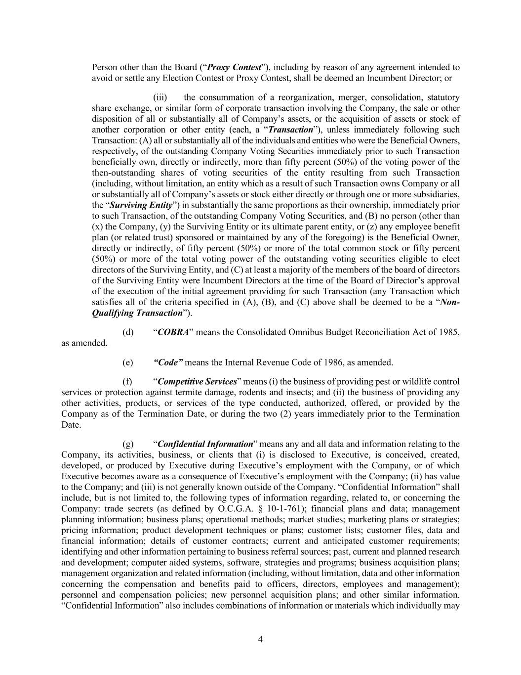 4 Person other than the Board (“Proxy Contest”), including by reason of any agreement intended to avoid or settle any Election Contest or Proxy Contest, shall be deemed an Incumbent Director; or (iii) the consummation of a reorganization, merger, consolidation, statutory share exchange, or similar form of corporate transaction involving the Company, the sale or other disposition of all or substantially all of Company’s assets, or the acquisition of assets or stock of another corporation or other entity (each, a “Transaction”), unless immediately following such Transaction: (A) all or substantially all of the individuals and entities who were the Beneficial Owners, respectively, of the outstanding Company Voting Securities immediately prior to such Transaction beneficially own, directly or indirectly, more than fifty percent (50%) of the voting power of the then-outstanding shares of voting securities of the entity resulting from such Transaction (including, without limitation, an entity which as a result of such Transaction owns Company or all or substantially all of Company’s assets or stock either directly or through one or more subsidiaries, the “Surviving Entity”) in substantially the same proportions as their ownership, immediately prior to such Transaction, of the outstanding Company Voting Securities, and (B) no person (other than (x) the Company, (y) the Surviving Entity or its ultimate parent entity, or (z) any employee benefit plan (or related trust) sponsored or maintained by any of the foregoing) is the Beneficial Owner, directly or indirectly, of fifty percent (50%) or more of the total common stock or fifty percent (50%) or more of the total voting power of the outstanding voting securities eligible to elect directors of the Surviving Entity, and (C) at least a majority of the members of the board of directors of the Surviving Entity were Incumbent Directors at the time of the Board of Director’s approval of the execution of the initial agreement providing for such Transaction (any Transaction which satisfies all of the criteria specified in (A), (B), and (C) above shall be deemed to be a “Non- Qualifying Transaction”). (d) “COBRA” means the Consolidated Omnibus Budget Reconciliation Act of 1985, as amended. (e) “Code” means the Internal Revenue Code of 1986, as amended. (f) “Competitive Services” means (i) the business of providing pest or wildlife control services or protection against termite damage, rodents and insects; and (ii) the business of providing any other activities, products, or services of the type conducted, authorized, offered, or provided by the Company as of the Termination Date, or during the two (2) years immediately prior to the Termination Date. (g) “Confidential Information” means any and all data and information relating to the Company, its activities, business, or clients that (i) is disclosed to Executive, is conceived, created, developed, or produced by Executive during Executive’s employment with the Company, or of which Executive becomes aware as a consequence of Executive’s employment with the Company; (ii) has value to the Company; and (iii) is not generally known outside of the Company. “Confidential Information” shall include, but is not limited to, the following types of information regarding, related to, or concerning the Company: trade secrets (as defined by O.C.G.A. § 10-1-761); financial plans and data; management planning information; business plans; operational methods; market studies; marketing plans or strategies; pricing information; product development techniques or plans; customer lists; customer files, data and financial information; details of customer contracts; current and anticipated customer requirements; identifying and other information pertaining to business referral sources; past, current and planned research and development; computer aided systems, software, strategies and programs; business acquisition plans; management organization and related information (including, without limitation, data and other information concerning the compensation and benefits paid to officers, directors, employees and management); personnel and compensation policies; new personnel acquisition plans; and other similar information. “Confidential Information” also includes combinations of information or materials which individually may