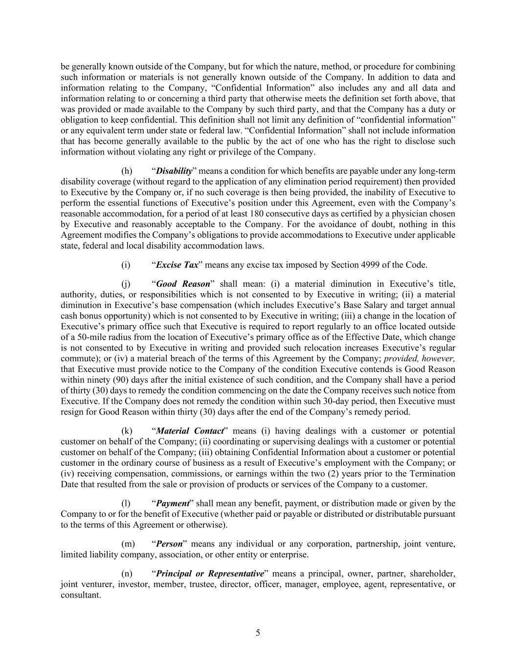 5 be generally known outside of the Company, but for which the nature, method, or procedure for combining such information or materials is not generally known outside of the Company. In addition to data and information relating to the Company, “Confidential Information” also includes any and all data and information relating to or concerning a third party that otherwise meets the definition set forth above, that was provided or made available to the Company by such third party, and that the Company has a duty or obligation to keep confidential. This definition shall not limit any definition of “confidential information” or any equivalent term under state or federal law. “Confidential Information” shall not include information that has become generally available to the public by the act of one who has the right to disclose such information without violating any right or privilege of the Company. (h) “Disability” means a condition for which benefits are payable under any long-term disability coverage (without regard to the application of any elimination period requirement) then provided to Executive by the Company or, if no such coverage is then being provided, the inability of Executive to perform the essential functions of Executive’s position under this Agreement, even with the Company’s reasonable accommodation, for a period of at least 180 consecutive days as certified by a physician chosen by Executive and reasonably acceptable to the Company. For the avoidance of doubt, nothing in this Agreement modifies the Company’s obligations to provide accommodations to Executive under applicable state, federal and local disability accommodation laws. (i) “Excise Tax” means any excise tax imposed by Section 4999 of the Code. (j) “Good Reason” shall mean: (i) a material diminution in Executive’s title, authority, duties, or responsibilities which is not consented to by Executive in writing; (ii) a material diminution in Executive’s base compensation (which includes Executive’s Base Salary and target annual cash bonus opportunity) which is not consented to by Executive in writing; (iii) a change in the location of Executive’s primary office such that Executive is required to report regularly to an office located outside of a 50-mile radius from the location of Executive’s primary office as of the Effective Date, which change is not consented to by Executive in writing and provided such relocation increases Executive’s regular commute); or (iv) a material breach of the terms of this Agreement by the Company; provided, however, that Executive must provide notice to the Company of the condition Executive contends is Good Reason within ninety (90) days after the initial existence of such condition, and the Company shall have a period of thirty (30) days to remedy the condition commencing on the date the Company receives such notice from Executive. If the Company does not remedy the condition within such 30-day period, then Executive must resign for Good Reason within thirty (30) days after the end of the Company’s remedy period. (k) “Material Contact” means (i) having dealings with a customer or potential customer on behalf of the Company; (ii) coordinating or supervising dealings with a customer or potential customer on behalf of the Company; (iii) obtaining Confidential Information about a customer or potential customer in the ordinary course of business as a result of Executive’s employment with the Company; or (iv) receiving compensation, commissions, or earnings within the two (2) years prior to the Termination Date that resulted from the sale or provision of products or services of the Company to a customer. (l) “Payment” shall mean any benefit, payment, or distribution made or given by the Company to or for the benefit of Executive (whether paid or payable or distributed or distributable pursuant to the terms of this Agreement or otherwise). (m) “Person” means any individual or any corporation, partnership, joint venture, limited liability company, association, or other entity or enterprise. (n) “Principal or Representative” means a principal, owner, partner, shareholder, joint venturer, investor, member, trustee, director, officer, manager, employee, agent, representative, or consultant.