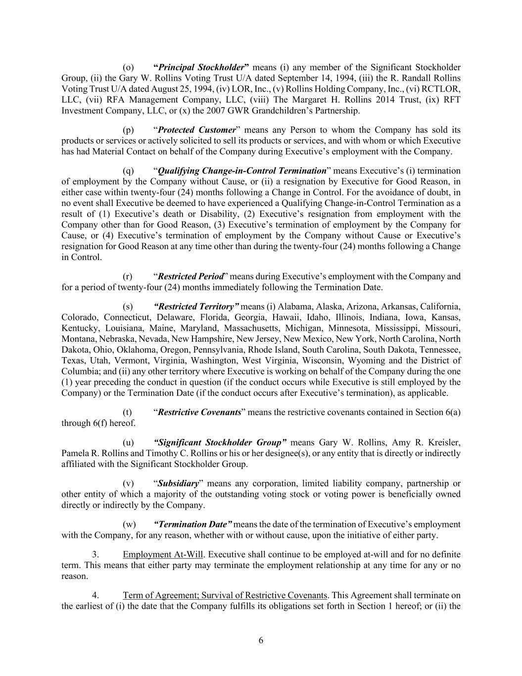 6 (o) “Principal Stockholder” means (i) any member of the Significant Stockholder Group, (ii) the Gary W. Rollins Voting Trust U/A dated September 14, 1994, (iii) the R. Randall Rollins Voting Trust U/A dated August 25, 1994, (iv) LOR, Inc., (v) Rollins Holding Company, Inc., (vi) RCTLOR, LLC, (vii) RFA Management Company, LLC, (viii) The Margaret H. Rollins 2014 Trust, (ix) RFT Investment Company, LLC, or (x) the 2007 GWR Grandchildren’s Partnership. (p) “Protected Customer” means any Person to whom the Company has sold its products or services or actively solicited to sell its products or services, and with whom or which Executive has had Material Contact on behalf of the Company during Executive’s employment with the Company. (q) “Qualifying Change-in-Control Termination” means Executive’s (i) termination of employment by the Company without Cause, or (ii) a resignation by Executive for Good Reason, in either case within twenty-four (24) months following a Change in Control. For the avoidance of doubt, in no event shall Executive be deemed to have experienced a Qualifying Change-in-Control Termination as a result of (1) Executive’s death or Disability, (2) Executive’s resignation from employment with the Company other than for Good Reason, (3) Executive’s termination of employment by the Company for Cause, or (4) Executive’s termination of employment by the Company without Cause or Executive’s resignation for Good Reason at any time other than during the twenty-four (24) months following a Change in Control. (r) “Restricted Period” means during Executive’s employment with the Company and for a period of twenty-four (24) months immediately following the Termination Date. (s) “Restricted Territory” means (i) Alabama, Alaska, Arizona, Arkansas, California, Colorado, Connecticut, Delaware, Florida, Georgia, Hawaii, Idaho, Illinois, Indiana, Iowa, Kansas, Kentucky, Louisiana, Maine, Maryland, Massachusetts, Michigan, Minnesota, Mississippi, Missouri, Montana, Nebraska, Nevada, New Hampshire, New Jersey, New Mexico, New York, North Carolina, North Dakota, Ohio, Oklahoma, Oregon, Pennsylvania, Rhode Island, South Carolina, South Dakota, Tennessee, Texas, Utah, Vermont, Virginia, Washington, West Virginia, Wisconsin, Wyoming and the District of Columbia; and (ii) any other territory where Executive is working on behalf of the Company during the one (1) year preceding the conduct in question (if the conduct occurs while Executive is still employed by the Company) or the Termination Date (if the conduct occurs after Executive’s termination), as applicable. (t) “Restrictive Covenants” means the restrictive covenants contained in Section 6(a) through 6(f) hereof. (u) “Significant Stockholder Group” means Gary W. Rollins, Amy R. Kreisler, Pamela R. Rollins and Timothy C. Rollins or his or her designee(s), or any entity that is directly or indirectly affiliated with the Significant Stockholder Group. (v) “Subsidiary” means any corporation, limited liability company, partnership or other entity of which a majority of the outstanding voting stock or voting power is beneficially owned directly or indirectly by the Company. (w) “Termination Date” means the date of the termination of Executive’s employment with the Company, for any reason, whether with or without cause, upon the initiative of either party. 3. Employment At-Will. Executive shall continue to be employed at-will and for no definite term. This means that either party may terminate the employment relationship at any time for any or no reason. 4. Term of Agreement; Survival of Restrictive Covenants. This Agreement shall terminate on the earliest of (i) the date that the Company fulfills its obligations set forth in Section 1 hereof; or (ii) the