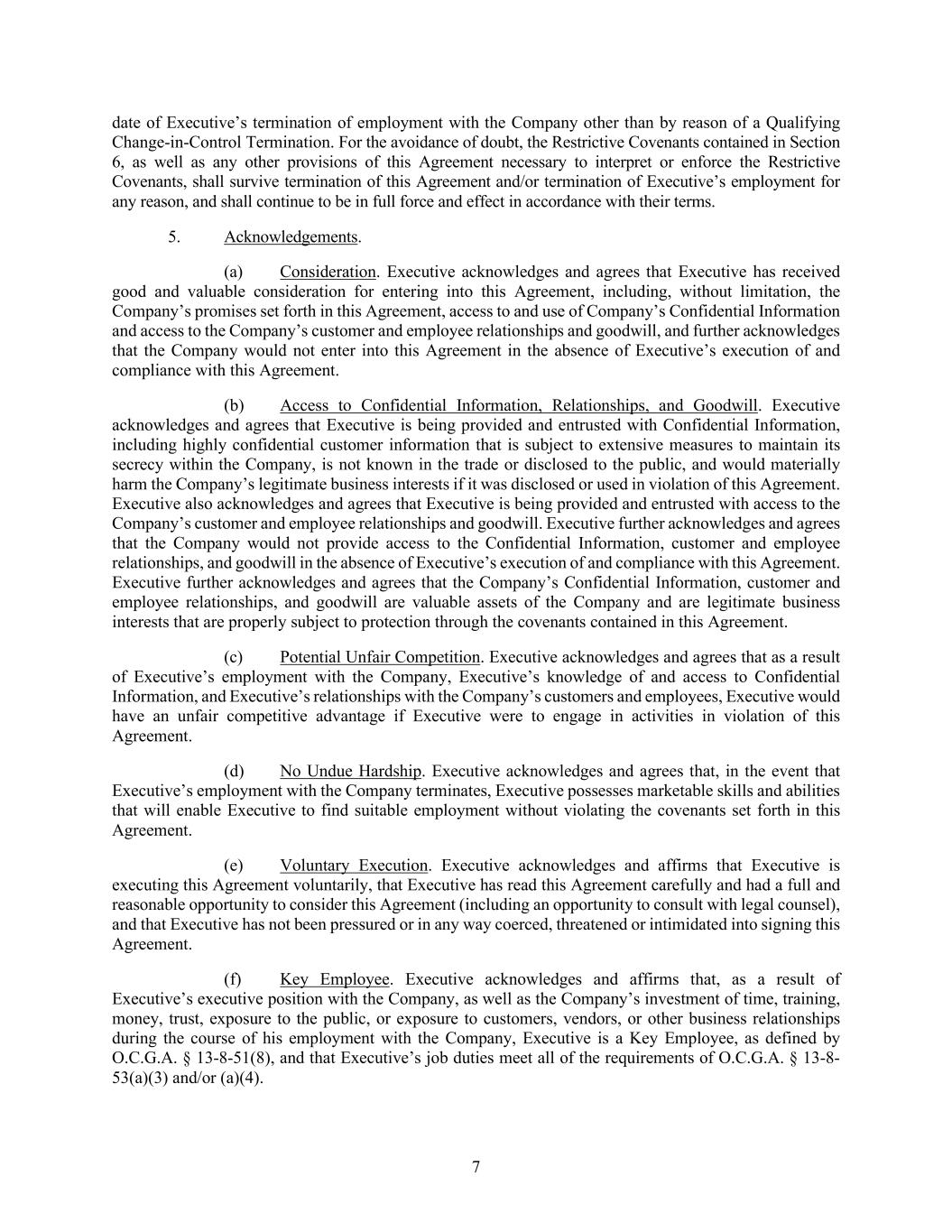 7 date of Executive’s termination of employment with the Company other than by reason of a Qualifying Change-in-Control Termination. For the avoidance of doubt, the Restrictive Covenants contained in Section 6, as well as any other provisions of this Agreement necessary to interpret or enforce the Restrictive Covenants, shall survive termination of this Agreement and/or termination of Executive’s employment for any reason, and shall continue to be in full force and effect in accordance with their terms. 5. Acknowledgements. (a) Consideration. Executive acknowledges and agrees that Executive has received good and valuable consideration for entering into this Agreement, including, without limitation, the Company’s promises set forth in this Agreement, access to and use of Company’s Confidential Information and access to the Company’s customer and employee relationships and goodwill, and further acknowledges that the Company would not enter into this Agreement in the absence of Executive’s execution of and compliance with this Agreement. (b) Access to Confidential Information, Relationships, and Goodwill. Executive acknowledges and agrees that Executive is being provided and entrusted with Confidential Information, including highly confidential customer information that is subject to extensive measures to maintain its secrecy within the Company, is not known in the trade or disclosed to the public, and would materially harm the Company’s legitimate business interests if it was disclosed or used in violation of this Agreement. Executive also acknowledges and agrees that Executive is being provided and entrusted with access to the Company’s customer and employee relationships and goodwill. Executive further acknowledges and agrees that the Company would not provide access to the Confidential Information, customer and employee relationships, and goodwill in the absence of Executive’s execution of and compliance with this Agreement. Executive further acknowledges and agrees that the Company’s Confidential Information, customer and employee relationships, and goodwill are valuable assets of the Company and are legitimate business interests that are properly subject to protection through the covenants contained in this Agreement. (c) Potential Unfair Competition. Executive acknowledges and agrees that as a result of Executive’s employment with the Company, Executive’s knowledge of and access to Confidential Information, and Executive’s relationships with the Company’s customers and employees, Executive would have an unfair competitive advantage if Executive were to engage in activities in violation of this Agreement. (d) No Undue Hardship. Executive acknowledges and agrees that, in the event that Executive’s employment with the Company terminates, Executive possesses marketable skills and abilities that will enable Executive to find suitable employment without violating the covenants set forth in this Agreement. (e) Voluntary Execution. Executive acknowledges and affirms that Executive is executing this Agreement voluntarily, that Executive has read this Agreement carefully and had a full and reasonable opportunity to consider this Agreement (including an opportunity to consult with legal counsel), and that Executive has not been pressured or in any way coerced, threatened or intimidated into signing this Agreement. (f) Key Employee. Executive acknowledges and affirms that, as a result of Executive’s executive position with the Company, as well as the Company’s investment of time, training, money, trust, exposure to the public, or exposure to customers, vendors, or other business relationships during the course of his employment with the Company, Executive is a Key Employee, as defined by O.C.G.A. § 13-8-51(8), and that Executive’s job duties meet all of the requirements of O.C.G.A. § 13-8- 53(a)(3) and/or (a)(4).