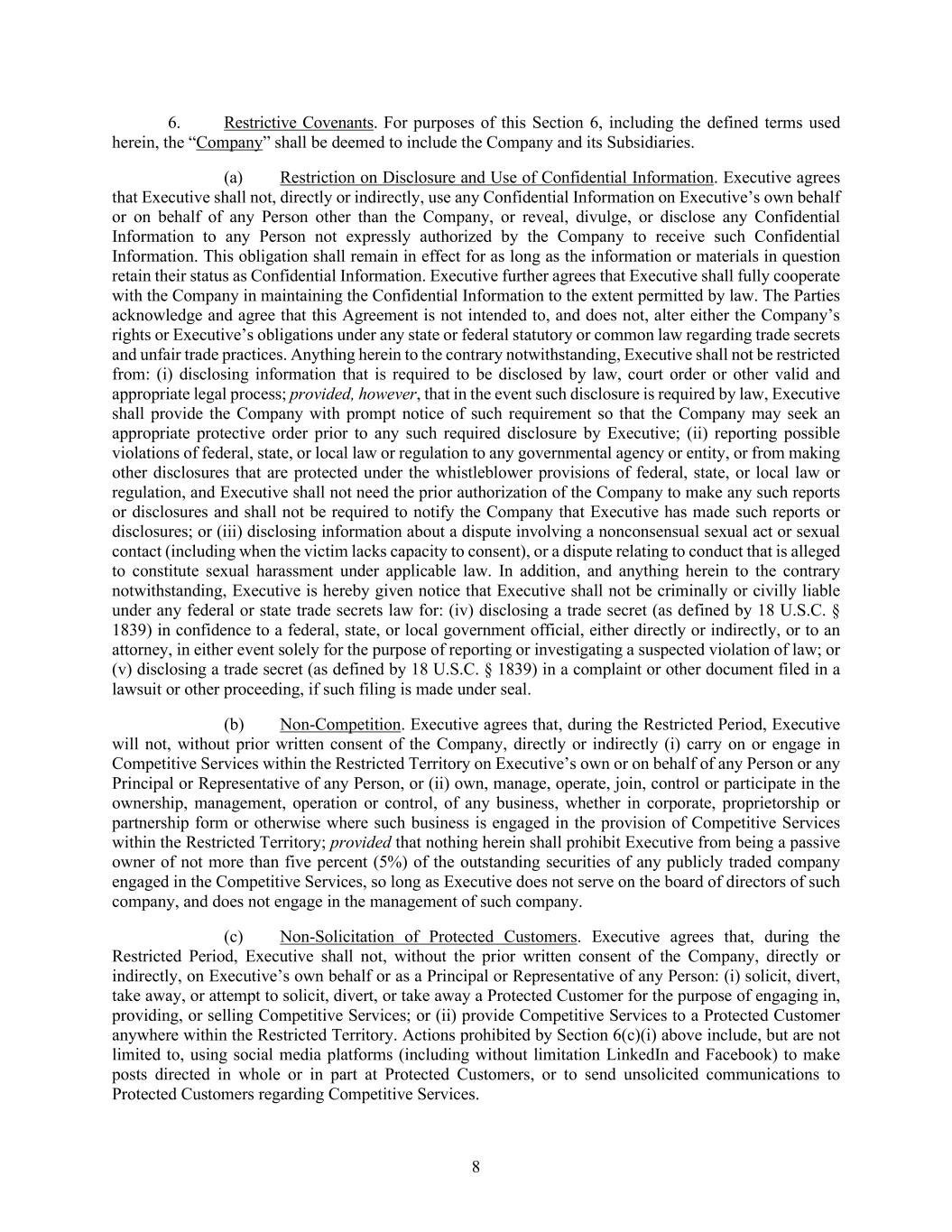8 6. Restrictive Covenants. For purposes of this Section 6, including the defined terms used herein, the “Company” shall be deemed to include the Company and its Subsidiaries. (a) Restriction on Disclosure and Use of Confidential Information. Executive agrees that Executive shall not, directly or indirectly, use any Confidential Information on Executive’s own behalf or on behalf of any Person other than the Company, or reveal, divulge, or disclose any Confidential Information to any Person not expressly authorized by the Company to receive such Confidential Information. This obligation shall remain in effect for as long as the information or materials in question retain their status as Confidential Information. Executive further agrees that Executive shall fully cooperate with the Company in maintaining the Confidential Information to the extent permitted by law. The Parties acknowledge and agree that this Agreement is not intended to, and does not, alter either the Company’s rights or Executive’s obligations under any state or federal statutory or common law regarding trade secrets and unfair trade practices. Anything herein to the contrary notwithstanding, Executive shall not be restricted from: (i) disclosing information that is required to be disclosed by law, court order or other valid and appropriate legal process; provided, however, that in the event such disclosure is required by law, Executive shall provide the Company with prompt notice of such requirement so that the Company may seek an appropriate protective order prior to any such required disclosure by Executive; (ii) reporting possible violations of federal, state, or local law or regulation to any governmental agency or entity, or from making other disclosures that are protected under the whistleblower provisions of federal, state, or local law or regulation, and Executive shall not need the prior authorization of the Company to make any such reports or disclosures and shall not be required to notify the Company that Executive has made such reports or disclosures; or (iii) disclosing information about a dispute involving a nonconsensual sexual act or sexual contact (including when the victim lacks capacity to consent), or a dispute relating to conduct that is alleged to constitute sexual harassment under applicable law. In addition, and anything herein to the contrary notwithstanding, Executive is hereby given notice that Executive shall not be criminally or civilly liable under any federal or state trade secrets law for: (iv) disclosing a trade secret (as defined by 18 U.S.C. § 1839) in confidence to a federal, state, or local government official, either directly or indirectly, or to an attorney, in either event solely for the purpose of reporting or investigating a suspected violation of law; or (v) disclosing a trade secret (as defined by 18 U.S.C. § 1839) in a complaint or other document filed in a lawsuit or other proceeding, if such filing is made under seal. (b) Non-Competition. Executive agrees that, during the Restricted Period, Executive will not, without prior written consent of the Company, directly or indirectly (i) carry on or engage in Competitive Services within the Restricted Territory on Executive’s own or on behalf of any Person or any Principal or Representative of any Person, or (ii) own, manage, operate, join, control or participate in the ownership, management, operation or control, of any business, whether in corporate, proprietorship or partnership form or otherwise where such business is engaged in the provision of Competitive Services within the Restricted Territory; provided that nothing herein shall prohibit Executive from being a passive owner of not more than five percent (5%) of the outstanding securities of any publicly traded company engaged in the Competitive Services, so long as Executive does not serve on the board of directors of such company, and does not engage in the management of such company. (c) Non-Solicitation of Protected Customers. Executive agrees that, during the Restricted Period, Executive shall not, without the prior written consent of the Company, directly or indirectly, on Executive’s own behalf or as a Principal or Representative of any Person: (i) solicit, divert, take away, or attempt to solicit, divert, or take away a Protected Customer for the purpose of engaging in, providing, or selling Competitive Services; or (ii) provide Competitive Services to a Protected Customer anywhere within the Restricted Territory. Actions prohibited by Section 6(c)(i) above include, but are not limited to, using social media platforms (including without limitation LinkedIn and Facebook) to make posts directed in whole or in part at Protected Customers, or to send unsolicited communications to Protected Customers regarding Competitive Services.