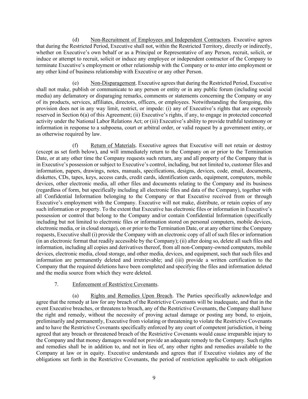 9 (d) Non-Recruitment of Employees and Independent Contractors. Executive agrees that during the Restricted Period, Executive shall not, within the Restricted Territory, directly or indirectly, whether on Executive’s own behalf or as a Principal or Representative of any Person, recruit, solicit, or induce or attempt to recruit, solicit or induce any employee or independent contractor of the Company to terminate Executive’s employment or other relationship with the Company or to enter into employment or any other kind of business relationship with Executive or any other Person. (e) Non-Disparagement. Executive agrees that during the Restricted Period, Executive shall not make, publish or communicate to any person or entity or in any public forum (including social media) any defamatory or disparaging remarks, comments or statements concerning the Company or any of its products, services, affiliates, directors, officers, or employees. Notwithstanding the foregoing, this provision does not in any way limit, restrict, or impede: (i) any of Executive’s rights that are expressly reserved in Section 6(a) of this Agreement; (ii) Executive’s rights, if any, to engage in protected concerted activity under the National Labor Relations Act; or (iii) Executive’s ability to provide truthful testimony or information in response to a subpoena, court or arbitral order, or valid request by a government entity, or as otherwise required by law. (f) Return of Materials. Executive agrees that Executive will not retain or destroy (except as set forth below), and will immediately return to the Company on or prior to the Termination Date, or at any other time the Company requests such return, any and all property of the Company that is in Executive’s possession or subject to Executive’s control, including, but not limited to, customer files and information, papers, drawings, notes, manuals, specifications, designs, devices, code, email, documents, diskettes, CDs, tapes, keys, access cards, credit cards, identification cards, equipment, computers, mobile devices, other electronic media, all other files and documents relating to the Company and its business (regardless of form, but specifically including all electronic files and data of the Company), together with all Confidential Information belonging to the Company or that Executive received from or through Executive’s employment with the Company. Executive will not make, distribute, or retain copies of any such information or property. To the extent that Executive has electronic files or information in Executive’s possession or control that belong to the Company and/or contain Confidential Information (specifically including but not limited to electronic files or information stored on personal computers, mobile devices, electronic media, or in cloud storage), on or prior to the Termination Date, or at any other time the Company requests, Executive shall (i) provide the Company with an electronic copy of all of such files or information (in an electronic format that readily accessible by the Company); (ii) after doing so, delete all such files and information, including all copies and derivatives thereof, from all non-Company-owned computers, mobile devices, electronic media, cloud storage, and other media, devices, and equipment, such that such files and information are permanently deleted and irretrievable; and (iii) provide a written certification to the Company that the required deletions have been completed and specifying the files and information deleted and the media source from which they were deleted. 7. Enforcement of Restrictive Covenants. (a) Rights and Remedies Upon Breach. The Parties specifically acknowledge and agree that the remedy at law for any breach of the Restrictive Covenants will be inadequate, and that in the event Executive breaches, or threatens to breach, any of the Restrictive Covenants, the Company shall have the right and remedy, without the necessity of proving actual damage or posting any bond, to enjoin, preliminarily and permanently, Executive from violating or threatening to violate the Restrictive Covenants and to have the Restrictive Covenants specifically enforced by any court of competent jurisdiction, it being agreed that any breach or threatened breach of the Restrictive Covenants would cause irreparable injury to the Company and that money damages would not provide an adequate remedy to the Company. Such rights and remedies shall be in addition to, and not in lieu of, any other rights and remedies available to the Company at law or in equity. Executive understands and agrees that if Executive violates any of the obligations set forth in the Restrictive Covenants, the period of restriction applicable to each obligation