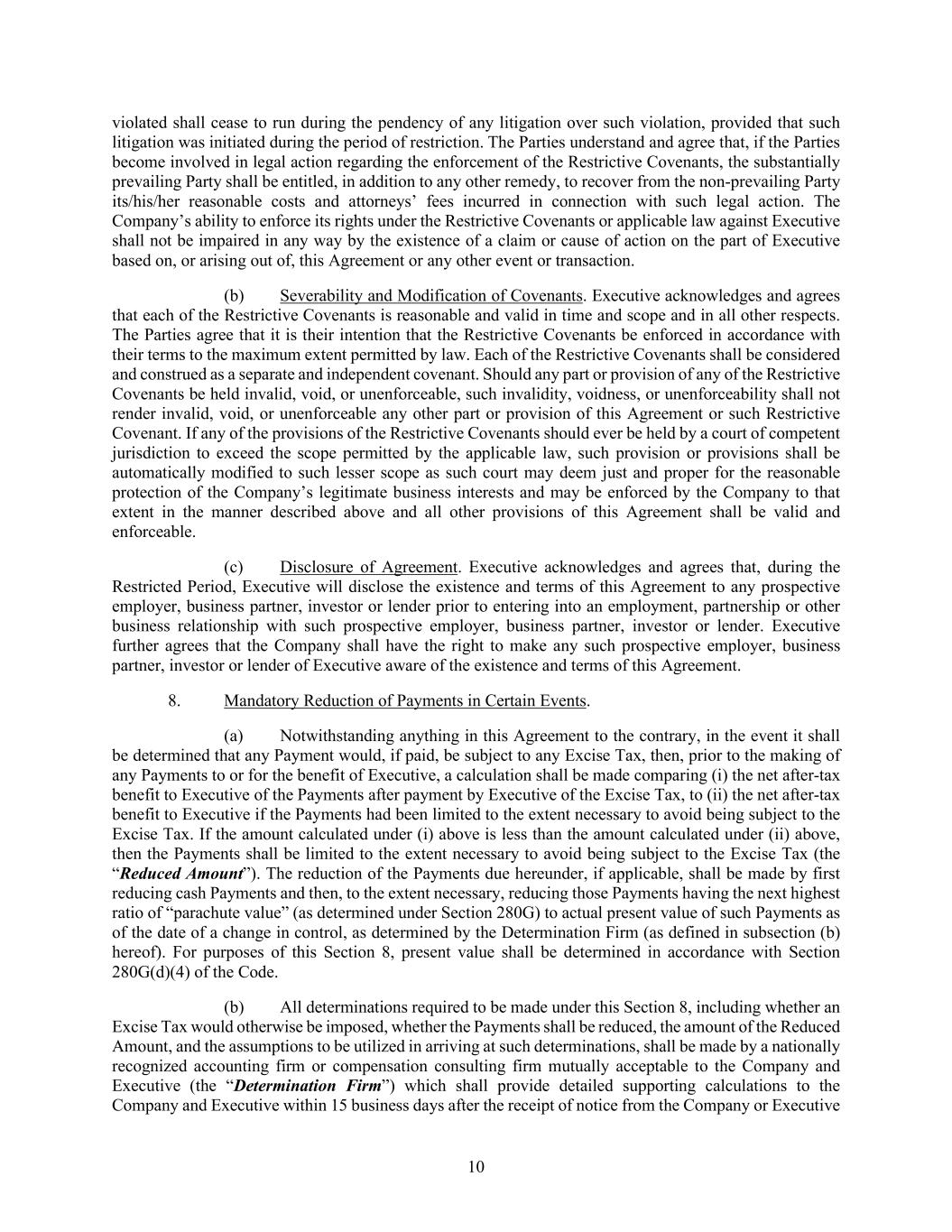 10 violated shall cease to run during the pendency of any litigation over such violation, provided that such litigation was initiated during the period of restriction. The Parties understand and agree that, if the Parties become involved in legal action regarding the enforcement of the Restrictive Covenants, the substantially prevailing Party shall be entitled, in addition to any other remedy, to recover from the non-prevailing Party its/his/her reasonable costs and attorneys’ fees incurred in connection with such legal action. The Company’s ability to enforce its rights under the Restrictive Covenants or applicable law against Executive shall not be impaired in any way by the existence of a claim or cause of action on the part of Executive based on, or arising out of, this Agreement or any other event or transaction. (b) Severability and Modification of Covenants. Executive acknowledges and agrees that each of the Restrictive Covenants is reasonable and valid in time and scope and in all other respects. The Parties agree that it is their intention that the Restrictive Covenants be enforced in accordance with their terms to the maximum extent permitted by law. Each of the Restrictive Covenants shall be considered and construed as a separate and independent covenant. Should any part or provision of any of the Restrictive Covenants be held invalid, void, or unenforceable, such invalidity, voidness, or unenforceability shall not render invalid, void, or unenforceable any other part or provision of this Agreement or such Restrictive Covenant. If any of the provisions of the Restrictive Covenants should ever be held by a court of competent jurisdiction to exceed the scope permitted by the applicable law, such provision or provisions shall be automatically modified to such lesser scope as such court may deem just and proper for the reasonable protection of the Company’s legitimate business interests and may be enforced by the Company to that extent in the manner described above and all other provisions of this Agreement shall be valid and enforceable. (c) Disclosure of Agreement. Executive acknowledges and agrees that, during the Restricted Period, Executive will disclose the existence and terms of this Agreement to any prospective employer, business partner, investor or lender prior to entering into an employment, partnership or other business relationship with such prospective employer, business partner, investor or lender. Executive further agrees that the Company shall have the right to make any such prospective employer, business partner, investor or lender of Executive aware of the existence and terms of this Agreement. 8. Mandatory Reduction of Payments in Certain Events. (a) Notwithstanding anything in this Agreement to the contrary, in the event it shall be determined that any Payment would, if paid, be subject to any Excise Tax, then, prior to the making of any Payments to or for the benefit of Executive, a calculation shall be made comparing (i) the net after-tax benefit to Executive of the Payments after payment by Executive of the Excise Tax, to (ii) the net after-tax benefit to Executive if the Payments had been limited to the extent necessary to avoid being subject to the Excise Tax. If the amount calculated under (i) above is less than the amount calculated under (ii) above, then the Payments shall be limited to the extent necessary to avoid being subject to the Excise Tax (the “Reduced Amount”). The reduction of the Payments due hereunder, if applicable, shall be made by first reducing cash Payments and then, to the extent necessary, reducing those Payments having the next highest ratio of “parachute value” (as determined under Section 280G) to actual present value of such Payments as of the date of a change in control, as determined by the Determination Firm (as defined in subsection (b) hereof). For purposes of this Section 8, present value shall be determined in accordance with Section 280G(d)(4) of the Code. (b) All determinations required to be made under this Section 8, including whether an Excise Tax would otherwise be imposed, whether the Payments shall be reduced, the amount of the Reduced Amount, and the assumptions to be utilized in arriving at such determinations, shall be made by a nationally recognized accounting firm or compensation consulting firm mutually acceptable to the Company and Executive (the “Determination Firm”) which shall provide detailed supporting calculations to the Company and Executive within 15 business days after the receipt of notice from the Company or Executive