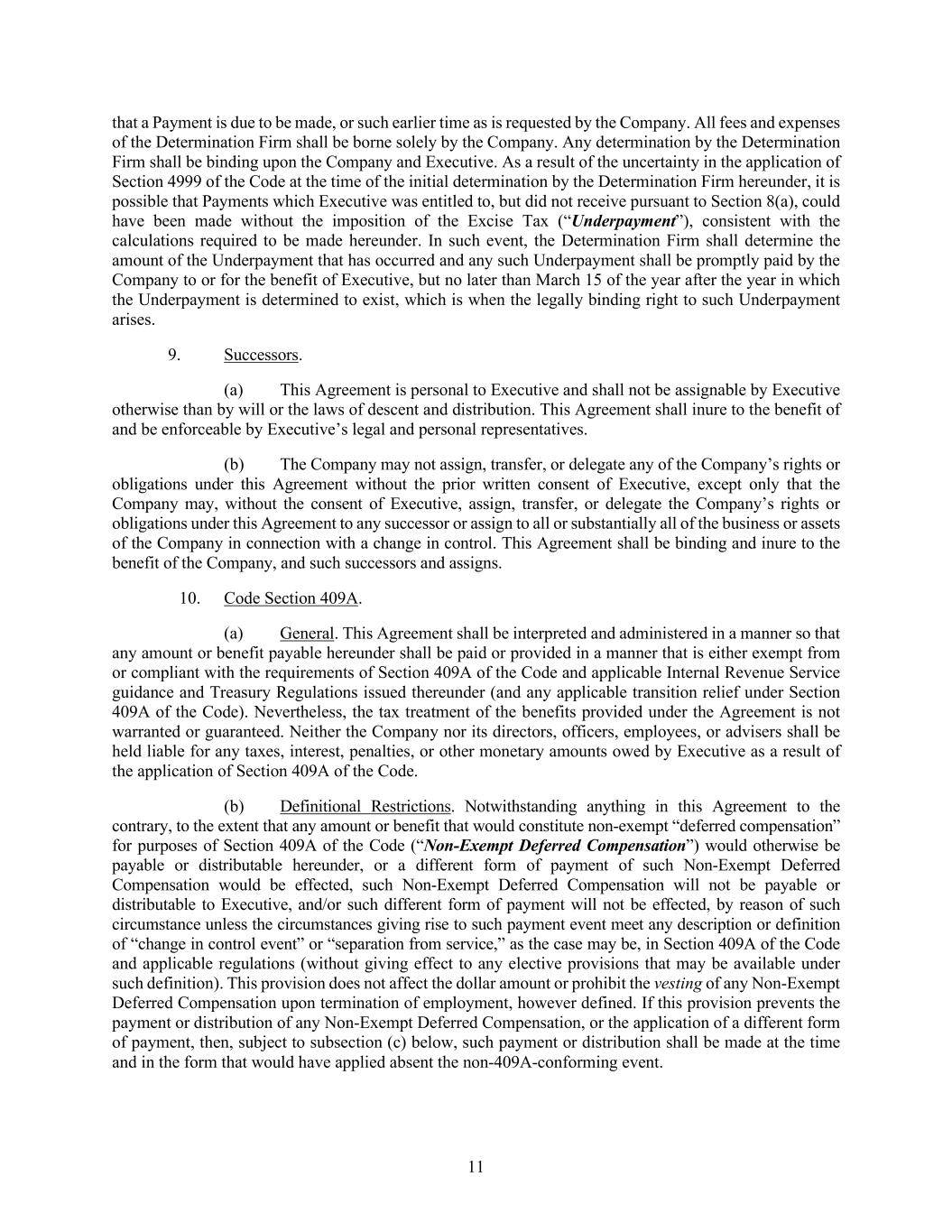 11 that a Payment is due to be made, or such earlier time as is requested by the Company. All fees and expenses of the Determination Firm shall be borne solely by the Company. Any determination by the Determination Firm shall be binding upon the Company and Executive. As a result of the uncertainty in the application of Section 4999 of the Code at the time of the initial determination by the Determination Firm hereunder, it is possible that Payments which Executive was entitled to, but did not receive pursuant to Section 8(a), could have been made without the imposition of the Excise Tax (“Underpayment”), consistent with the calculations required to be made hereunder. In such event, the Determination Firm shall determine the amount of the Underpayment that has occurred and any such Underpayment shall be promptly paid by the Company to or for the benefit of Executive, but no later than March 15 of the year after the year in which the Underpayment is determined to exist, which is when the legally binding right to such Underpayment arises. 9. Successors. (a) This Agreement is personal to Executive and shall not be assignable by Executive otherwise than by will or the laws of descent and distribution. This Agreement shall inure to the benefit of and be enforceable by Executive’s legal and personal representatives. (b) The Company may not assign, transfer, or delegate any of the Company’s rights or obligations under this Agreement without the prior written consent of Executive, except only that the Company may, without the consent of Executive, assign, transfer, or delegate the Company’s rights or obligations under this Agreement to any successor or assign to all or substantially all of the business or assets of the Company in connection with a change in control. This Agreement shall be binding and inure to the benefit of the Company, and such successors and assigns. 10. Code Section 409A. (a) General. This Agreement shall be interpreted and administered in a manner so that any amount or benefit payable hereunder shall be paid or provided in a manner that is either exempt from or compliant with the requirements of Section 409A of the Code and applicable Internal Revenue Service guidance and Treasury Regulations issued thereunder (and any applicable transition relief under Section 409A of the Code). Nevertheless, the tax treatment of the benefits provided under the Agreement is not warranted or guaranteed. Neither the Company nor its directors, officers, employees, or advisers shall be held liable for any taxes, interest, penalties, or other monetary amounts owed by Executive as a result of the application of Section 409A of the Code. (b) Definitional Restrictions. Notwithstanding anything in this Agreement to the contrary, to the extent that any amount or benefit that would constitute non-exempt “deferred compensation” for purposes of Section 409A of the Code (“Non-Exempt Deferred Compensation”) would otherwise be payable or distributable hereunder, or a different form of payment of such Non-Exempt Deferred Compensation would be effected, such Non-Exempt Deferred Compensation will not be payable or distributable to Executive, and/or such different form of payment will not be effected, by reason of such circumstance unless the circumstances giving rise to such payment event meet any description or definition of “change in control event” or “separation from service,” as the case may be, in Section 409A of the Code and applicable regulations (without giving effect to any elective provisions that may be available under such definition). This provision does not affect the dollar amount or prohibit the vesting of any Non-Exempt Deferred Compensation upon termination of employment, however defined. If this provision prevents the payment or distribution of any Non-Exempt Deferred Compensation, or the application of a different form of payment, then, subject to subsection (c) below, such payment or distribution shall be made at the time and in the form that would have applied absent the non-409A-conforming event.