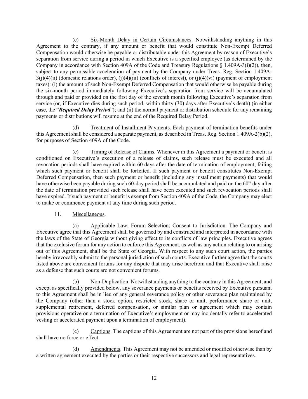 12 (c) Six-Month Delay in Certain Circumstances. Notwithstanding anything in this Agreement to the contrary, if any amount or benefit that would constitute Non-Exempt Deferred Compensation would otherwise be payable or distributable under this Agreement by reason of Executive’s separation from service during a period in which Executive is a specified employee (as determined by the Company in accordance with Section 409A of the Code and Treasury Regulations § 1.409A-3(i)(2)), then, subject to any permissible acceleration of payment by the Company under Treas. Reg. Section 1.409A- 3(j)(4)(ii) (domestic relations order), (j)(4)(iii) (conflicts of interest), or (j)(4)(vi) (payment of employment taxes): (i) the amount of such Non-Exempt Deferred Compensation that would otherwise be payable during the six-month period immediately following Executive’s separation from service will be accumulated through and paid or provided on the first day of the seventh month following Executive’s separation from service (or, if Executive dies during such period, within thirty (30) days after Executive’s death) (in either case, the “Required Delay Period”); and (ii) the normal payment or distribution schedule for any remaining payments or distributions will resume at the end of the Required Delay Period. (d) Treatment of Installment Payments. Each payment of termination benefits under this Agreement shall be considered a separate payment, as described in Treas. Reg. Section 1.409A-2(b)(2), for purposes of Section 409A of the Code. (e) Timing of Release of Claims. Whenever in this Agreement a payment or benefit is conditioned on Executive’s execution of a release of claims, such release must be executed and all revocation periods shall have expired within 60 days after the date of termination of employment; failing which such payment or benefit shall be forfeited. If such payment or benefit constitutes Non-Exempt Deferred Compensation, then such payment or benefit (including any installment payments) that would have otherwise been payable during such 60-day period shall be accumulated and paid on the 60th day after the date of termination provided such release shall have been executed and such revocation periods shall have expired. If such payment or benefit is exempt from Section 409A of the Code, the Company may elect to make or commence payment at any time during such period. 11. Miscellaneous. (a) Applicable Law; Forum Selection; Consent to Jurisdiction. The Company and Executive agree that this Agreement shall be governed by and construed and interpreted in accordance with the laws of the State of Georgia without giving effect to its conflicts of law principles. Executive agrees that the exclusive forum for any action to enforce this Agreement, as well as any action relating to or arising out of this Agreement, shall be the State of Georgia. With respect to any such court action, the parties hereby irrevocably submit to the personal jurisdiction of such courts. Executive further agree that the courts listed above are convenient forums for any dispute that may arise herefrom and that Executive shall raise as a defense that such courts are not convenient forums. (b) Non-Duplication. Notwithstanding anything to the contrary in this Agreement, and except as specifically provided below, any severance payments or benefits received by Executive pursuant to this Agreement shall be in lieu of any general severance policy or other severance plan maintained by the Company (other than a stock option, restricted stock, share or unit, performance share or unit, supplemental retirement, deferred compensation, or similar plan or agreement which may contain provisions operative on a termination of Executive’s employment or may incidentally refer to accelerated vesting or accelerated payment upon a termination of employment). (c) Captions. The captions of this Agreement are not part of the provisions hereof and shall have no force or effect. (d) Amendments. This Agreement may not be amended or modified otherwise than by a written agreement executed by the parties or their respective successors and legal representatives.