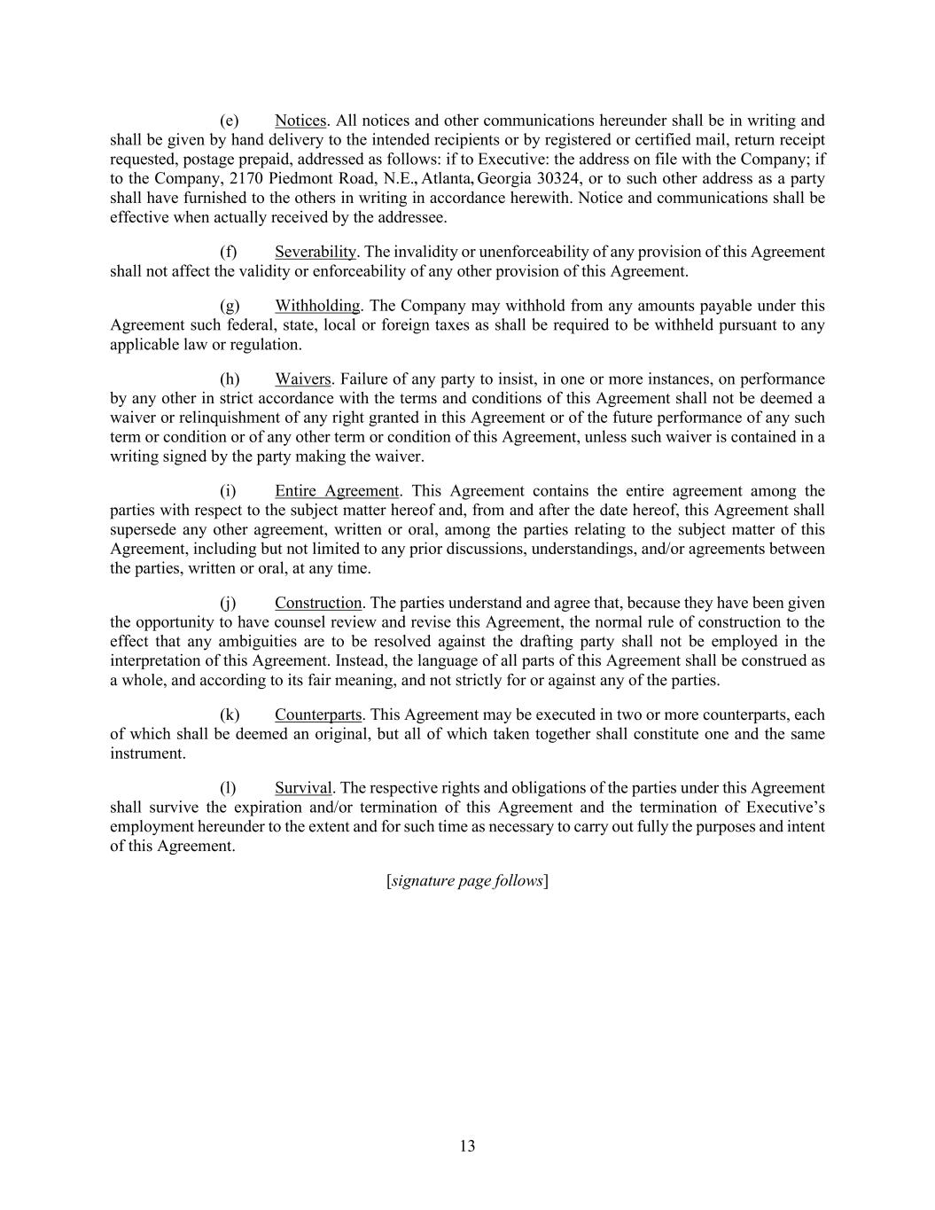 13 (e) Notices. All notices and other communications hereunder shall be in writing and shall be given by hand delivery to the intended recipients or by registered or certified mail, return receipt requested, postage prepaid, addressed as follows: if to Executive: the address on file with the Company; if to the Company, 2170 Piedmont Road, N.E., Atlanta, Georgia 30324, or to such other address as a party shall have furnished to the others in writing in accordance herewith. Notice and communications shall be effective when actually received by the addressee. (f) Severability. The invalidity or unenforceability of any provision of this Agreement shall not affect the validity or enforceability of any other provision of this Agreement. (g) Withholding. The Company may withhold from any amounts payable under this Agreement such federal, state, local or foreign taxes as shall be required to be withheld pursuant to any applicable law or regulation. (h) Waivers. Failure of any party to insist, in one or more instances, on performance by any other in strict accordance with the terms and conditions of this Agreement shall not be deemed a waiver or relinquishment of any right granted in this Agreement or of the future performance of any such term or condition or of any other term or condition of this Agreement, unless such waiver is contained in a writing signed by the party making the waiver. (i) Entire Agreement. This Agreement contains the entire agreement among the parties with respect to the subject matter hereof and, from and after the date hereof, this Agreement shall supersede any other agreement, written or oral, among the parties relating to the subject matter of this Agreement, including but not limited to any prior discussions, understandings, and/or agreements between the parties, written or oral, at any time. (j) Construction. The parties understand and agree that, because they have been given the opportunity to have counsel review and revise this Agreement, the normal rule of construction to the effect that any ambiguities are to be resolved against the drafting party shall not be employed in the interpretation of this Agreement. Instead, the language of all parts of this Agreement shall be construed as a whole, and according to its fair meaning, and not strictly for or against any of the parties. (k) Counterparts. This Agreement may be executed in two or more counterparts, each of which shall be deemed an original, but all of which taken together shall constitute one and the same instrument. (l) Survival. The respective rights and obligations of the parties under this Agreement shall survive the expiration and/or termination of this Agreement and the termination of Executive’s employment hereunder to the extent and for such time as necessary to carry out fully the purposes and intent of this Agreement. [signature page follows]
