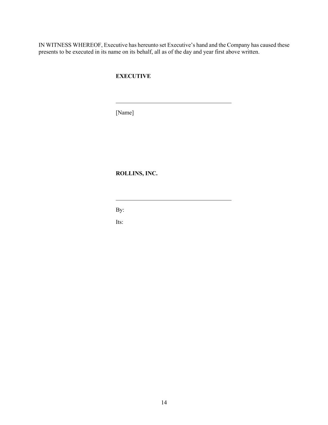 14 IN WITNESS WHEREOF, Executive has hereunto set Executive’s hand and the Company has caused these presents to be executed in its name on its behalf, all as of the day and year first above written. EXECUTIVE [Name] ROLLINS, INC. By: Its: