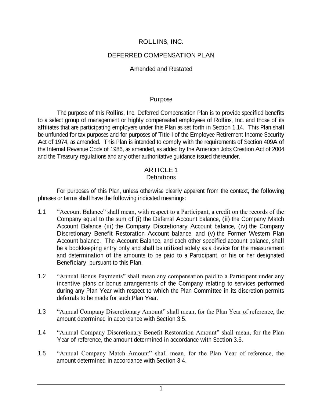 1 ROLLINS, INC. DEFERRED COMPENSATION PLAN Amended and Restated Purpose The purpose of this Rollins, Inc. Deferred Compensation Plan is to provide specified benefits to a select group of management or highly compensated employees of Rollins, Inc. and those of its affiliates that are participating employers under this Plan as set forth in Section 1.14. This Plan shall be unfunded for tax purposes and for purposes of Title I of the Employee Retirement Income Security Act of 1974, as amended. This Plan is intended to comply with the requirements of Section 409A of the Internal Revenue Code of 1986, as amended, as added by the American Jobs Creation Act of 2004 and the Treasury regulations and any other authoritative guidance issued thereunder. ARTICLE 1 Definitions For purposes of this Plan, unless otherwise clearly apparent from the context, the following phrases or terms shall have the following indicated meanings: 1.1 “Account Balance” shall mean, with respect to a Participant, a credit on the records of the Company equal to the sum of (i) the Deferral Account balance, (ii) the Company Match Account Balance (iii) the Company Discretionary Account balance, (iv) the Company Discretionary Benefit Restoration Account balance, and (v) the Former Western Plan Account balance. The Account Balance, and each other specified account balance, shall be a bookkeeping entry only and shall be utilized solely as a device for the measurement and determination of the amounts to be paid to a Participant, or his or her designated Beneficiary, pursuant to this Plan. 1.2 “Annual Bonus Payments” shall mean any compensation paid to a Participant under any incentive plans or bonus arrangements of the Company relating to services performed during any Plan Year with respect to which the Plan Committee in its discretion permits deferrals to be made for such Plan Year. 1.3 “Annual Company Discretionary Amount” shall mean, for the Plan Year of reference, the amount determined in accordance with Section 3.5. 1.4 “Annual Company Discretionary Benefit Restoration Amount” shall mean, for the Plan Year of reference, the amount determined in accordance with Section 3.6. 1.5 “Annual Company Match Amount” shall mean, for the Plan Year of reference, the amount determined in accordance with Section 3.4.