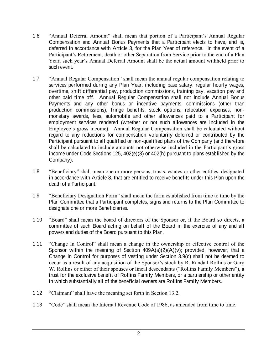 2 1.6 “Annual Deferral Amount” shall mean that portion of a Participant’s Annual Regular Compensation and Annual Bonus Payments that a Participant elects to have, and is, deferred in accordance with Article 3, for the Plan Year of reference. In the event of a Participant’s Retirement, death or other Separation from Service prior to the end of a Plan Year, such year’s Annual Deferral Amount shall be the actual amount withheld prior to such event. 1.7 “Annual Regular Compensation” shall mean the annual regular compensation relating to services performed during any Plan Year, including base salary, regular hourly wages, overtime, shift differential pay, production commissions, training pay, vacation pay and other paid time off. Annual Regular Compensation shall not include Annual Bonus Payments and any other bonus or incentive payments, commissions (other than production commissions), fringe benefits, stock options, relocation expenses, non- monetary awards, fees, automobile and other allowances paid to a Participant for employment services rendered (whether or not such allowances are included in the Employee’s gross income). Annual Regular Compensation shall be calculated without regard to any reductions for compensation voluntarily deferred or contributed by the Participant pursuant to all qualified or non-qualified plans of the Company (and therefore shall be calculated to include amounts not otherwise included in the Participant’s gross income under Code Sections 125, 402(e)(3) or 402(h) pursuant to plans established by the Company). 1.8 “Beneficiary” shall mean one or more persons, trusts, estates or other entities, designated in accordance with Article 8, that are entitled to receive benefits under this Plan upon the death of a Participant. 1.9 “Beneficiary Designation Form” shall mean the form established from time to time by the Plan Committee that a Participant completes, signs and returns to the Plan Committee to designate one or more Beneficiaries. 1.10 “Board” shall mean the board of directors of the Sponsor or, if the Board so directs, a committee of such Board acting on behalf of the Board in the exercise of any and all powers and duties of the Board pursuant to this Plan. 1.11 “Change In Control” shall mean a change in the ownership or effective control of the Sponsor within the meaning of Section 409A(a)(2)(A)(v); provided, however, that a Change in Control for purposes of vesting under Section 3.9(c) shall not be deemed to occur as a result of any acquisition of the Sponsor’s stock by R. Randall Rollins or Gary W. Rollins or either of their spouses or lineal descendants (”Rollins Family Members”), a trust for the exclusive benefit of Rollins Family Members, or a partnership or other entity in which substantially all of the beneficial owners are Rollins Family Members. 1.12 “Claimant” shall have the meaning set forth in Section 13.2. 1.13 “Code” shall mean the Internal Revenue Code of 1986, as amended from time to time.