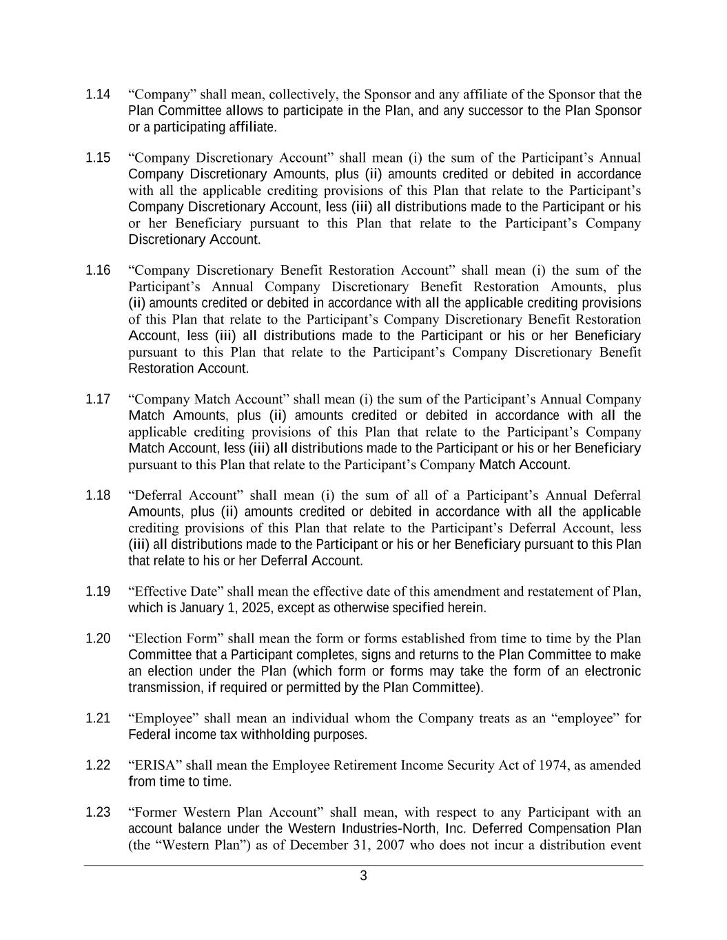 3 1.14 “Company” shall mean, collectively, the Sponsor and any affiliate of the Sponsor that the Plan Committee allows to participate in the Plan, and any successor to the Plan Sponsor or a participating affiliate. 1.15 “Company Discretionary Account” shall mean (i) the sum of the Participant’s Annual Company Discretionary Amounts, plus (ii) amounts credited or debited in accordance with all the applicable crediting provisions of this Plan that relate to the Participant’s Company Discretionary Account, less (iii) all distributions made to the Participant or his or her Beneficiary pursuant to this Plan that relate to the Participant’s Company Discretionary Account. 1.16 “Company Discretionary Benefit Restoration Account” shall mean (i) the sum of the Participant’s Annual Company Discretionary Benefit Restoration Amounts, plus (ii) amounts credited or debited in accordance with all the applicable crediting provisions of this Plan that relate to the Participant’s Company Discretionary Benefit Restoration Account, less (iii) all distributions made to the Participant or his or her Beneficiary pursuant to this Plan that relate to the Participant’s Company Discretionary Benefit Restoration Account. 1.17 “Company Match Account” shall mean (i) the sum of the Participant’s Annual Company Match Amounts, plus (ii) amounts credited or debited in accordance with all the applicable crediting provisions of this Plan that relate to the Participant’s Company Match Account, less (iii) all distributions made to the Participant or his or her Beneficiary pursuant to this Plan that relate to the Participant’s Company Match Account. 1.18 “Deferral Account” shall mean (i) the sum of all of a Participant’s Annual Deferral Amounts, plus (ii) amounts credited or debited in accordance with all the applicable crediting provisions of this Plan that relate to the Participant’s Deferral Account, less (iii) all distributions made to the Participant or his or her Beneficiary pursuant to this Plan that relate to his or her Deferral Account. 1.19 “Effective Date” shall mean the effective date of this amendment and restatement of Plan, which is January 1, 2025, except as otherwise specified herein. 1.20 “Election Form” shall mean the form or forms established from time to time by the Plan Committee that a Participant completes, signs and returns to the Plan Committee to make an election under the Plan (which form or forms may take the form of an electronic transmission, if required or permitted by the Plan Committee). 1.21 “Employee” shall mean an individual whom the Company treats as an “employee” for Federal income tax withholding purposes. 1.22 “ERISA” shall mean the Employee Retirement Income Security Act of 1974, as amended from time to time. 1.23 “Former Western Plan Account” shall mean, with respect to any Participant with an account balance under the Western Industries-North, Inc. Deferred Compensation Plan (the “Western Plan”) as of December 31, 2007 who does not incur a distribution event