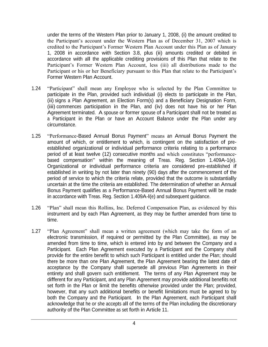 4 under the terms of the Western Plan prior to January 1, 2008, (i) the amount credited to the Participant’s account under the Western Plan as of December 31, 2007 which is credited to the Participant’s Former Western Plan Account under this Plan as of January 1, 2008 in accordance with Section 3.8, plus (ii) amounts credited or debited in accordance with all the applicable crediting provisions of this Plan that relate to the Participant’s Former Western Plan Account, less (iii) all distributions made to the Participant or his or her Beneficiary pursuant to this Plan that relate to the Participant’s Former Western Plan Account. 1.24 “Participant” shall mean any Employee who is selected by the Plan Committee to participate in the Plan, provided such individual (i) elects to participate in the Plan, (ii) signs a Plan Agreement, an Election Form(s) and a Beneficiary Designation Form, (iii) commences participation in the Plan, and (iv) does not have his or her Plan Agreement terminated. A spouse or former spouse of a Participant shall not be treated as a Participant in the Plan or have an Account Balance under the Plan under any circumstance. 1.25 “Performance-Based Annual Bonus Payment” means an Annual Bonus Payment the amount of which, or entitlement to which, is contingent on the satisfaction of pre- established organizational or individual performance criteria relating to a performance period of at least twelve (12) consecutive months and which constitutes “performance- based compensation” within the meaning of Treas. Reg. Section 1.409A-1(e). Organizational or individual performance criteria are considered pre-established if established in writing by not later than ninety (90) days after the commencement of the period of service to which the criteria relate, provided that the outcome is substantially uncertain at the time the criteria are established. The determination of whether an Annual Bonus Payment qualifies as a Performance-Based Annual Bonus Payment will be made in accordance with Treas. Reg. Section 1.409A-l(e) and subsequent guidance. 1.26 “Plan” shall mean this Rollins, Inc. Deferred Compensation Plan, as evidenced by this instrument and by each Plan Agreement, as they may be further amended from time to time. 1.27 “Plan Agreement” shall mean a written agreement (which may take the form of an electronic transmission, if required or permitted by the Plan Committee), as may be amended from time to time, which is entered into by and between the Company and a Participant. Each Plan Agreement executed by a Participant and the Company shall provide for the entire benefit to which such Participant is entitled under the Plan; should there be more than one Plan Agreement, the Plan Agreement bearing the latest date of acceptance by the Company shall supersede all previous Plan Agreements in their entirety and shall govern such entitlement. The terms of any Plan Agreement may be different for any Participant, and any Plan Agreement may provide additional benefits not set forth in the Plan or limit the benefits otherwise provided under the Plan; provided, however, that any such additional benefits or benefit limitations must be agreed to by both the Company and the Participant. In the Plan Agreement, each Participant shall acknowledge that he or she accepts all of the terms of the Plan including the discretionary authority of the Plan Committee as set forth in Article 11.