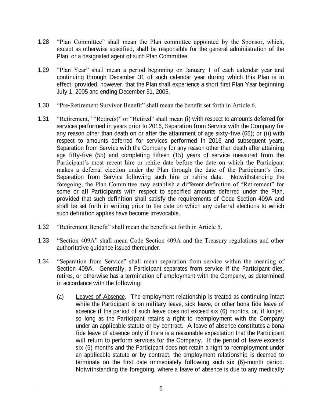 5 1.28 “Plan Committee” shall mean the Plan committee appointed by the Sponsor, which, except as otherwise specified, shall be responsible for the general administration of the Plan, or a designated agent of such Plan Committee. 1.29 “Plan Year” shall mean a period beginning on January 1 of each calendar year and continuing through December 31 of such calendar year during which this Plan is in effect; provided, however, that the Plan shall experience a short first Plan Year beginning July 1, 2005 and ending December 31, 2005. 1.30 “Pre-Retirement Survivor Benefit” shall mean the benefit set forth in Article 6. 1.31 “Retirement,” “Retire(s)” or “Retired” shall mean (i) with respect to amounts deferred for services performed in years prior to 2016, Separation from Service with the Company for any reason other than death on or after the attainment of age sixty-five (65); or (ii) with respect to amounts deferred for services performed in 2016 and subsequent years, Separation from Service with the Company for any reason other than death after attaining age fifty-five (55) and completing fifteen (15) years of service measured from the Participant’s most recent hire or rehire date before the date on which the Participant makes a deferral election under the Plan through the date of the Participant’s first Separation from Service following such hire or rehire date. Notwithstanding the foregoing, the Plan Committee may establish a different definition of “Retirement” for some or all Participants with respect to specified amounts deferred under the Plan, provided that such definition shall satisfy the requirements of Code Section 409A and shall be set forth in writing prior to the date on which any deferral elections to which such definition applies have become irrevocable. 1.32 “Retirement Benefit” shall mean the benefit set forth in Article 5. 1.33 “Section 409A” shall mean Code Section 409A and the Treasury regulations and other authoritative guidance issued thereunder. 1.34 “Separation from Service” shall mean separation from service within the meaning of Section 409A. Generally, a Participant separates from service if the Participant dies, retires, or otherwise has a termination of employment with the Company, as determined in accordance with the following: (a) Leaves of Absence. The employment relationship is treated as continuing intact while the Participant is on military leave, sick leave, or other bona fide leave of absence if the period of such leave does not exceed six (6) months, or, if longer, so long as the Participant retains a right to reemployment with the Company under an applicable statute or by contract. A leave of absence constitutes a bona fide leave of absence only if there is a reasonable expectation that the Participant will return to perform services for the Company. If the period of leave exceeds six (6) months and the Participant does not retain a right to reemployment under an applicable statute or by contract, the employment relationship is deemed to terminate on the first date immediately following such six (6)-month period. Notwithstanding the foregoing, where a leave of absence is due to any medically