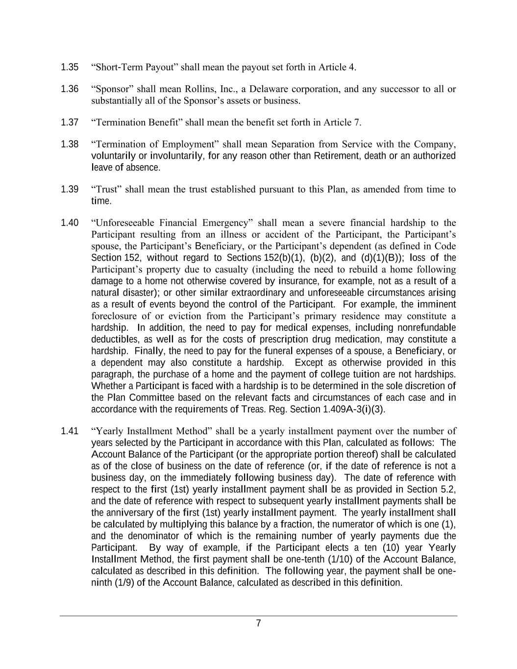 7 1.35 “Short-Term Payout” shall mean the payout set forth in Article 4. 1.36 “Sponsor” shall mean Rollins, Inc., a Delaware corporation, and any successor to all or substantially all of the Sponsor’s assets or business. 1.37 “Termination Benefit” shall mean the benefit set forth in Article 7. 1.38 “Termination of Employment” shall mean Separation from Service with the Company, voluntarily or involuntarily, for any reason other than Retirement, death or an authorized leave of absence. 1.39 “Trust” shall mean the trust established pursuant to this Plan, as amended from time to time. 1.40 “Unforeseeable Financial Emergency” shall mean a severe financial hardship to the Participant resulting from an illness or accident of the Participant, the Participant’s spouse, the Participant’s Beneficiary, or the Participant’s dependent (as defined in Code Section 152, without regard to Sections 152(b)(1), (b)(2), and (d)(1)(B)); loss of the Participant’s property due to casualty (including the need to rebuild a home following damage to a home not otherwise covered by insurance, for example, not as a result of a natural disaster); or other similar extraordinary and unforeseeable circumstances arising as a result of events beyond the control of the Participant. For example, the imminent foreclosure of or eviction from the Participant’s primary residence may constitute a hardship. In addition, the need to pay for medical expenses, including nonrefundable deductibles, as well as for the costs of prescription drug medication, may constitute a hardship. Finally, the need to pay for the funeral expenses of a spouse, a Beneficiary, or a dependent may also constitute a hardship. Except as otherwise provided in this paragraph, the purchase of a home and the payment of college tuition are not hardships. Whether a Participant is faced with a hardship is to be determined in the sole discretion of the Plan Committee based on the relevant facts and circumstances of each case and in accordance with the requirements of Treas. Reg. Section 1.409A-3(i)(3). 1.41 “Yearly Installment Method” shall be a yearly installment payment over the number of years selected by the Participant in accordance with this Plan, calculated as follows: The Account Balance of the Participant (or the appropriate portion thereof) shall be calculated as of the close of business on the date of reference (or, if the date of reference is not a business day, on the immediately following business day). The date of reference with respect to the first (1st) yearly installment payment shall be as provided in Section 5.2, and the date of reference with respect to subsequent yearly installment payments shall be the anniversary of the first (1st) yearly installment payment. The yearly installment shall be calculated by multiplying this balance by a fraction, the numerator of which is one (1), and the denominator of which is the remaining number of yearly payments due the Participant. By way of example, if the Participant elects a ten (10) year Yearly Installment Method, the first payment shall be one-tenth (1/10) of the Account Balance, calculated as described in this definition. The following year, the payment shall be one- ninth (1/9) of the Account Balance, calculated as described in this definition.