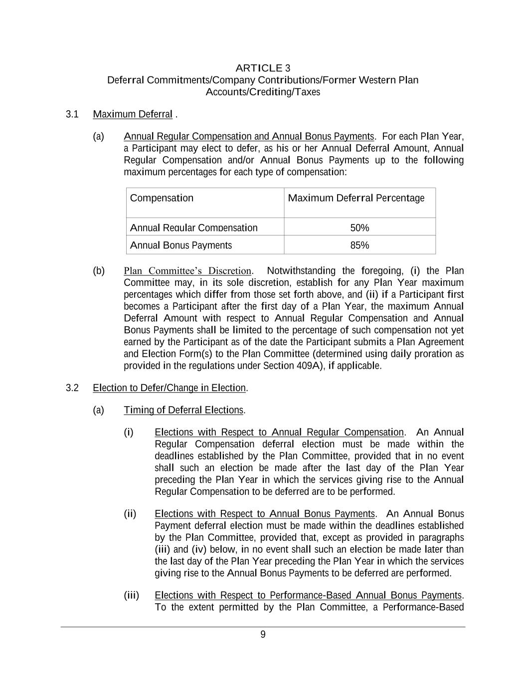 9 ARTICLE 3 Deferral Commitments/Company Contributions/Former Western Plan Accounts/Crediting/Taxes 3.1 Maximum Deferral . (a) Annual Regular Compensation and Annual Bonus Payments. For each Plan Year, a Participant may elect to defer, as his or her Annual Deferral Amount, Annual Regular Compensation and/or Annual Bonus Payments up to the following maximum percentages for each type of compensation: Compensation Maximum Deferral Percentage Annual Regular Compensation 50% Annual Bonus Payments 85% (b) Plan Committee’s Discretion. Notwithstanding the foregoing, (i) the Plan Committee may, in its sole discretion, establish for any Plan Year maximum percentages which differ from those set forth above, and (ii) if a Participant first becomes a Participant after the first day of a Plan Year, the maximum Annual Deferral Amount with respect to Annual Regular Compensation and Annual Bonus Payments shall be limited to the percentage of such compensation not yet earned by the Participant as of the date the Participant submits a Plan Agreement and Election Form(s) to the Plan Committee (determined using daily proration as provided in the regulations under Section 409A), if applicable. 3.2 Election to Defer/Change in Election. (a) Timing of Deferral Elections. (i) Elections with Respect to Annual Regular Compensation. An Annual Regular Compensation deferral election must be made within the deadlines established by the Plan Committee, provided that in no event shall such an election be made after the last day of the Plan Year preceding the Plan Year in which the services giving rise to the Annual Regular Compensation to be deferred are to be performed. (ii) Elections with Respect to Annual Bonus Payments. An Annual Bonus Payment deferral election must be made within the deadlines established by the Plan Committee, provided that, except as provided in paragraphs (iii) and (iv) below, in no event shall such an election be made later than the last day of the Plan Year preceding the Plan Year in which the services giving rise to the Annual Bonus Payments to be deferred are performed. (iii) Elections with Respect to Performance-Based Annual Bonus Payments. To the extent permitted by the Plan Committee, a Performance-Based
