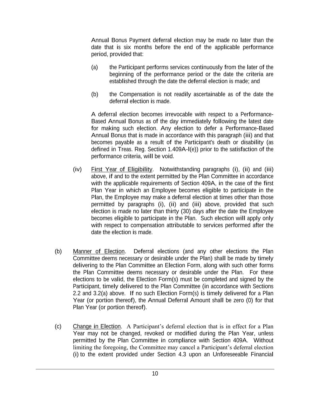 10 Annual Bonus Payment deferral election may be made no later than the date that is six months before the end of the applicable performance period, provided that: (a) the Participant performs services continuously from the later of the beginning of the performance period or the date the criteria are established through the date the deferral election is made; and (b) the Compensation is not readily ascertainable as of the date the deferral election is made. A deferral election becomes irrevocable with respect to a Performance- Based Annual Bonus as of the day immediately following the latest date for making such election. Any election to defer a Performance-Based Annual Bonus that is made in accordance with this paragraph (iii) and that becomes payable as a result of the Participant's death or disability (as defined in Treas. Reg. Section 1.409A-l(e)) prior to the satisfaction of the performance criteria, will be void. (iv) First Year of Eligibility. Notwithstanding paragraphs (i), (ii) and (iii) above, if and to the extent permitted by the Plan Committee in accordance with the applicable requirements of Section 409A, in the case of the first Plan Year in which an Employee becomes eligible to participate in the Plan, the Employee may make a deferral election at times other than those permitted by paragraphs (i), (ii) and (iii) above, provided that such election is made no later than thirty (30) days after the date the Employee becomes eligible to participate in the Plan. Such election will apply only with respect to compensation attributable to services performed after the date the election is made. (b) Manner of Election. Deferral elections (and any other elections the Plan Committee deems necessary or desirable under the Plan) shall be made by timely delivering to the Plan Committee an Election Form, along with such other forms the Plan Committee deems necessary or desirable under the Plan. For these elections to be valid, the Election Form(s) must be completed and signed by the Participant, timely delivered to the Plan Committee (in accordance with Sections 2.2 and 3.2(a) above. If no such Election Form(s) is timely delivered for a Plan Year (or portion thereof), the Annual Deferral Amount shall be zero (0) for that Plan Year (or portion thereof). (c) Change in Election. A Participant’s deferral election that is in effect for a Plan Year may not be changed, revoked or modified during the Plan Year, unless permitted by the Plan Committee in compliance with Section 409A. Without limiting the foregoing, the Committee may cancel a Participant’s deferral election (i) to the extent provided under Section 4.3 upon an Unforeseeable Financial