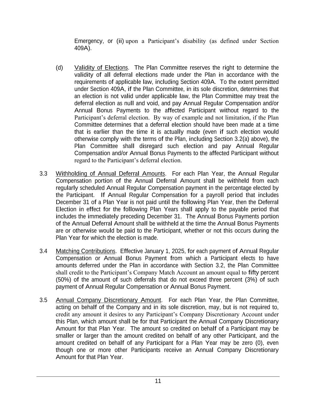 11 Emergency, or (ii) upon a Participant’s disability (as defined under Section 409A). (d) Validity of Elections. The Plan Committee reserves the right to determine the validity of all deferral elections made under the Plan in accordance with the requirements of applicable law, including Section 409A. To the extent permitted under Section 409A, if the Plan Committee, in its sole discretion, determines that an election is not valid under applicable law, the Plan Committee may treat the deferral election as null and void, and pay Annual Regular Compensation and/or Annual Bonus Payments to the affected Participant without regard to the Participant’s deferral election. By way of example and not limitation, if the Plan Committee determines that a deferral election should have been made at a time that is earlier than the time it is actually made (even if such election would otherwise comply with the terms of the Plan, including Section 3.2(a) above), the Plan Committee shall disregard such election and pay Annual Regular Compensation and/or Annual Bonus Payments to the affected Participant without regard to the Participant’s deferral election. 3.3 Withholding of Annual Deferral Amounts. For each Plan Year, the Annual Regular Compensation portion of the Annual Deferral Amount shall be withheld from each regularly scheduled Annual Regular Compensation payment in the percentage elected by the Participant. If Annual Regular Compensation for a payroll period that includes December 31 of a Plan Year is not paid until the following Plan Year, then the Deferral Election in effect for the following Plan Years shall apply to the payable period that includes the immediately preceding December 31. The Annual Bonus Payments portion of the Annual Deferral Amount shall be withheld at the time the Annual Bonus Payments are or otherwise would be paid to the Participant, whether or not this occurs during the Plan Year for which the election is made. 3.4 Matching Contributions. Effective January 1, 2025, for each payment of Annual Regular Compensation or Annual Bonus Payment from which a Participant elects to have amounts deferred under the Plan in accordance with Section 3.2, the Plan Committee shall credit to the Participant’s Company Match Account an amount equal to fifty percent (50%) of the amount of such deferrals that do not exceed three percent (3%) of such payment of Annual Regular Compensation or Annual Bonus Payment. 3.5 Annual Company Discretionary Amount. For each Plan Year, the Plan Committee, acting on behalf of the Company and in its sole discretion, may, but is not required to, credit any amount it desires to any Participant’s Company Discretionary Account under this Plan, which amount shall be for that Participant the Annual Company Discretionary Amount for that Plan Year. The amount so credited on behalf of a Participant may be smaller or larger than the amount credited on behalf of any other Participant, and the amount credited on behalf of any Participant for a Plan Year may be zero (0), even though one or more other Participants receive an Annual Company Discretionary Amount for that Plan Year.