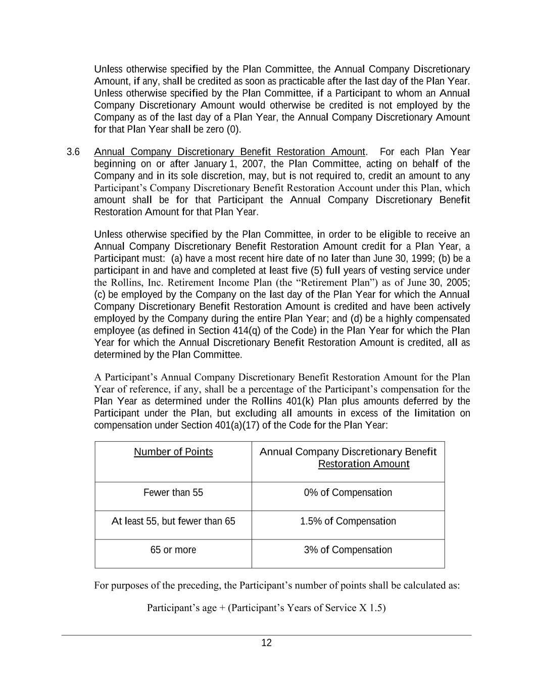 12 Unless otherwise specified by the Plan Committee, the Annual Company Discretionary Amount, if any, shall be credited as soon as practicable after the last day of the Plan Year. Unless otherwise specified by the Plan Committee, if a Participant to whom an Annual Company Discretionary Amount would otherwise be credited is not employed by the Company as of the last day of a Plan Year, the Annual Company Discretionary Amount for that Plan Year shall be zero (0). 3.6 Annual Company Discretionary Benefit Restoration Amount. For each Plan Year beginning on or after January 1, 2007, the Plan Committee, acting on behalf of the Company and in its sole discretion, may, but is not required to, credit an amount to any Participant’s Company Discretionary Benefit Restoration Account under this Plan, which amount shall be for that Participant the Annual Company Discretionary Benefit Restoration Amount for that Plan Year. Unless otherwise specified by the Plan Committee, in order to be eligible to receive an Annual Company Discretionary Benefit Restoration Amount credit for a Plan Year, a Participant must: (a) have a most recent hire date of no later than June 30, 1999; (b) be a participant in and have and completed at least five (5) full years of vesting service under the Rollins, Inc. Retirement Income Plan (the “Retirement Plan”) as of June 30, 2005; (c) be employed by the Company on the last day of the Plan Year for which the Annual Company Discretionary Benefit Restoration Amount is credited and have been actively employed by the Company during the entire Plan Year; and (d) be a highly compensated employee (as defined in Section 414(q) of the Code) in the Plan Year for which the Plan Year for which the Annual Discretionary Benefit Restoration Amount is credited, all as determined by the Plan Committee. A Participant’s Annual Company Discretionary Benefit Restoration Amount for the Plan Year of reference, if any, shall be a percentage of the Participant’s compensation for the Plan Year as determined under the Rollins 401(k) Plan plus amounts deferred by the Participant under the Plan, but excluding all amounts in excess of the limitation on compensation under Section 401(a)(17) of the Code for the Plan Year: Number of Points Annual Company Discretionary Benefit Restoration Amount Fewer than 55 0% of Compensation At least 55, but fewer than 65 1.5% of Compensation 65 or more 3% of Compensation For purposes of the preceding, the Participant’s number of points shall be calculated as: Participant’s age + (Participant’s Years of Service X 1.5)