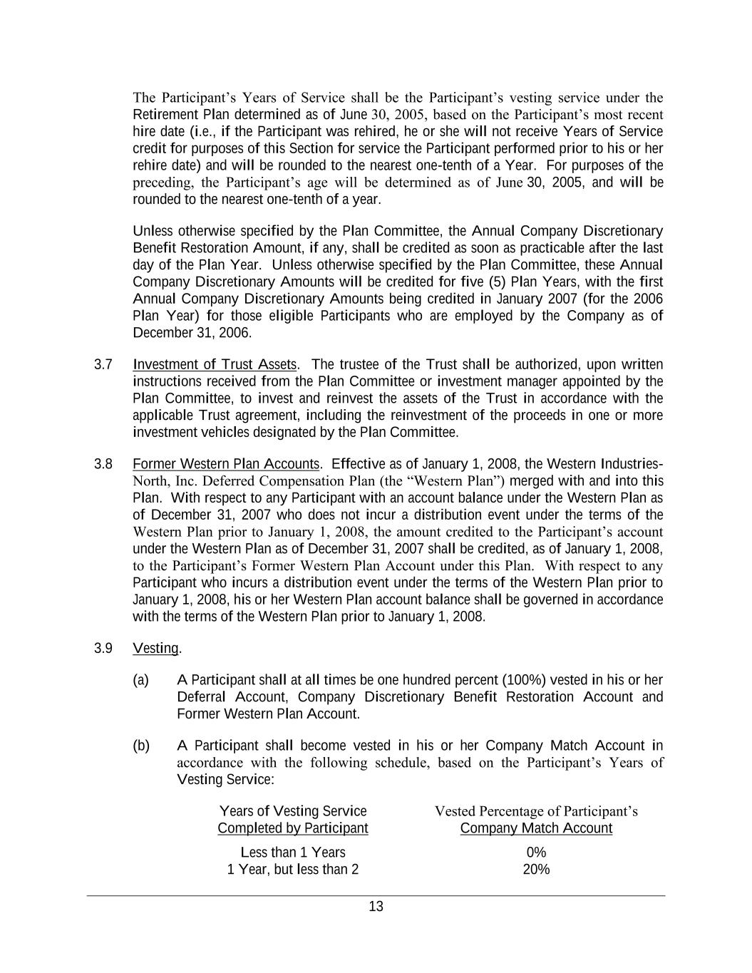 13 The Participant’s Years of Service shall be the Participant’s vesting service under the Retirement Plan determined as of June 30, 2005, based on the Participant’s most recent hire date (i.e., if the Participant was rehired, he or she will not receive Years of Service credit for purposes of this Section for service the Participant performed prior to his or her rehire date) and will be rounded to the nearest one-tenth of a Year. For purposes of the preceding, the Participant’s age will be determined as of June 30, 2005, and will be rounded to the nearest one-tenth of a year. Unless otherwise specified by the Plan Committee, the Annual Company Discretionary Benefit Restoration Amount, if any, shall be credited as soon as practicable after the last day of the Plan Year. Unless otherwise specified by the Plan Committee, these Annual Company Discretionary Amounts will be credited for five (5) Plan Years, with the first Annual Company Discretionary Amounts being credited in January 2007 (for the 2006 Plan Year) for those eligible Participants who are employed by the Company as of December 31, 2006. 3.7 Investment of Trust Assets. The trustee of the Trust shall be authorized, upon written instructions received from the Plan Committee or investment manager appointed by the Plan Committee, to invest and reinvest the assets of the Trust in accordance with the applicable Trust agreement, including the reinvestment of the proceeds in one or more investment vehicles designated by the Plan Committee. 3.8 Former Western Plan Accounts. Effective as of January 1, 2008, the Western Industries- North, Inc. Deferred Compensation Plan (the “Western Plan”) merged with and into this Plan. With respect to any Participant with an account balance under the Western Plan as of December 31, 2007 who does not incur a distribution event under the terms of the Western Plan prior to January 1, 2008, the amount credited to the Participant’s account under the Western Plan as of December 31, 2007 shall be credited, as of January 1, 2008, to the Participant’s Former Western Plan Account under this Plan. With respect to any Participant who incurs a distribution event under the terms of the Western Plan prior to January 1, 2008, his or her Western Plan account balance shall be governed in accordance with the terms of the Western Plan prior to January 1, 2008. 3.9 Vesting. (a) A Participant shall at all times be one hundred percent (100%) vested in his or her Deferral Account, Company Discretionary Benefit Restoration Account and Former Western Plan Account. (b) A Participant shall become vested in his or her Company Match Account in accordance with the following schedule, based on the Participant’s Years of Vesting Service: Years of Vesting Service Completed by Participant Vested Percentage of Participant’s Company Match Account Less than 1 Years 0% 1 Year, but less than 2 20%