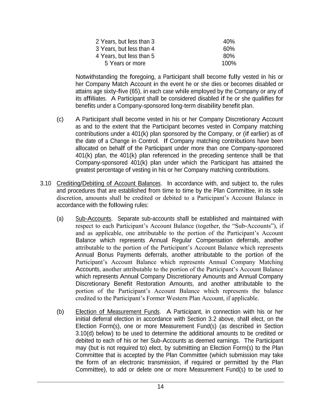 14 2 Years, but less than 3 40% 3 Years, but less than 4 60% 4 Years, but less than 5 80% 5 Years or more 100% Notwithstanding the foregoing, a Participant shall become fully vested in his or her Company Match Account in the event he or she dies or becomes disabled or attains age sixty-five (65), in each case while employed by the Company or any of its affiliates. A Participant shall be considered disabled if he or she qualifies for benefits under a Company-sponsored long-term disability benefit plan. (c) A Participant shall become vested in his or her Company Discretionary Account as and to the extent that the Participant becomes vested in Company matching contributions under a 401(k) plan sponsored by the Company, or (if earlier) as of the date of a Change in Control. If Company matching contributions have been allocated on behalf of the Participant under more than one Company-sponsored 401(k) plan, the 401(k) plan referenced in the preceding sentence shall be that Company-sponsored 401(k) plan under which the Participant has attained the greatest percentage of vesting in his or her Company matching contributions. 3.10 Crediting/Debiting of Account Balances. In accordance with, and subject to, the rules and procedures that are established from time to time by the Plan Committee, in its sole discretion, amounts shall be credited or debited to a Participant’s Account Balance in accordance with the following rules: (a) Sub-Accounts. Separate sub-accounts shall be established and maintained with respect to each Participant’s Account Balance (together, the “Sub-Accounts”), if and as applicable, one attributable to the portion of the Participant’s Account Balance which represents Annual Regular Compensation deferrals, another attributable to the portion of the Participant’s Account Balance which represents Annual Bonus Payments deferrals, another attributable to the portion of the Participant’s Account Balance which represents Annual Company Matching Accounts, another attributable to the portion of the Participant’s Account Balance which represents Annual Company Discretionary Amounts and Annual Company Discretionary Benefit Restoration Amounts, and another attributable to the portion of the Participant’s Account Balance which represents the balance credited to the Participant’s Former Western Plan Account, if applicable. (b) Election of Measurement Funds. A Participant, in connection with his or her initial deferral election in accordance with Section 3.2 above, shall elect, on the Election Form(s), one or more Measurement Fund(s) (as described in Section 3.10(d) below) to be used to determine the additional amounts to be credited or debited to each of his or her Sub-Accounts as deemed earnings. The Participant may (but is not required to) elect, by submitting an Election Form(s) to the Plan Committee that is accepted by the Plan Committee (which submission may take the form of an electronic transmission, if required or permitted by the Plan Committee), to add or delete one or more Measurement Fund(s) to be used to