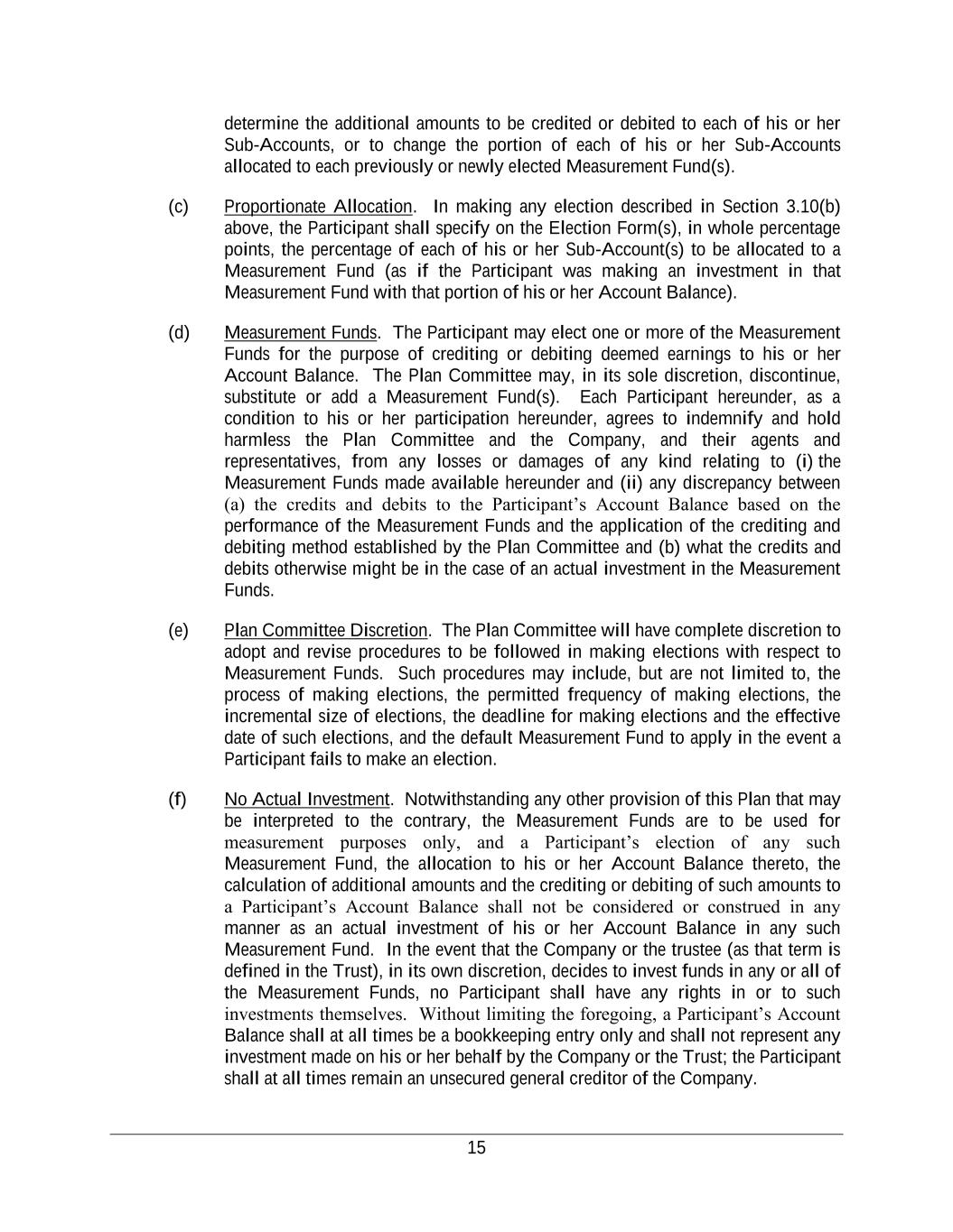 15 determine the additional amounts to be credited or debited to each of his or her Sub-Accounts, or to change the portion of each of his or her Sub-Accounts allocated to each previously or newly elected Measurement Fund(s). (c) Proportionate Allocation. In making any election described in Section 3.10(b) above, the Participant shall specify on the Election Form(s), in whole percentage points, the percentage of each of his or her Sub-Account(s) to be allocated to a Measurement Fund (as if the Participant was making an investment in that Measurement Fund with that portion of his or her Account Balance). (d) Measurement Funds. The Participant may elect one or more of the Measurement Funds for the purpose of crediting or debiting deemed earnings to his or her Account Balance. The Plan Committee may, in its sole discretion, discontinue, substitute or add a Measurement Fund(s). Each Participant hereunder, as a condition to his or her participation hereunder, agrees to indemnify and hold harmless the Plan Committee and the Company, and their agents and representatives, from any losses or damages of any kind relating to (i) the Measurement Funds made available hereunder and (ii) any discrepancy between (a) the credits and debits to the Participant’s Account Balance based on the performance of the Measurement Funds and the application of the crediting and debiting method established by the Plan Committee and (b) what the credits and debits otherwise might be in the case of an actual investment in the Measurement Funds. (e) Plan Committee Discretion. The Plan Committee will have complete discretion to adopt and revise procedures to be followed in making elections with respect to Measurement Funds. Such procedures may include, but are not limited to, the process of making elections, the permitted frequency of making elections, the incremental size of elections, the deadline for making elections and the effective date of such elections, and the default Measurement Fund to apply in the event a Participant fails to make an election. (f) No Actual Investment. Notwithstanding any other provision of this Plan that may be interpreted to the contrary, the Measurement Funds are to be used for measurement purposes only, and a Participant’s election of any such Measurement Fund, the allocation to his or her Account Balance thereto, the calculation of additional amounts and the crediting or debiting of such amounts to a Participant’s Account Balance shall not be considered or construed in any manner as an actual investment of his or her Account Balance in any such Measurement Fund. In the event that the Company or the trustee (as that term is defined in the Trust), in its own discretion, decides to invest funds in any or all of the Measurement Funds, no Participant shall have any rights in or to such investments themselves. Without limiting the foregoing, a Participant’s Account Balance shall at all times be a bookkeeping entry only and shall not represent any investment made on his or her behalf by the Company or the Trust; the Participant shall at all times remain an unsecured general creditor of the Company.