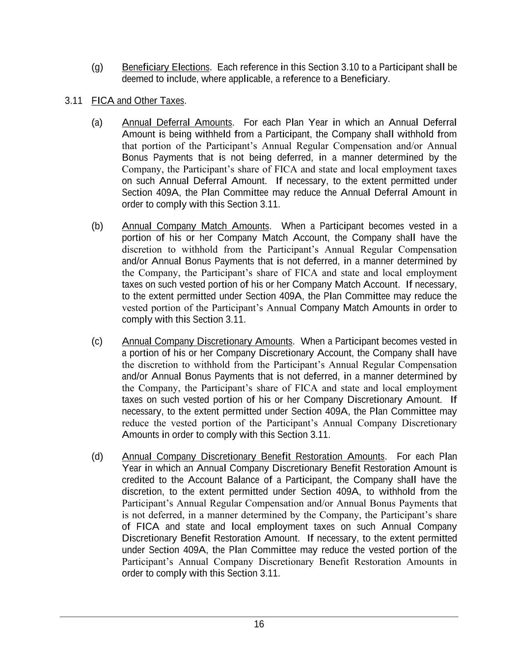16 (g) Beneficiary Elections. Each reference in this Section 3.10 to a Participant shall be deemed to include, where applicable, a reference to a Beneficiary. 3.11 FICA and Other Taxes. (a) Annual Deferral Amounts. For each Plan Year in which an Annual Deferral Amount is being withheld from a Participant, the Company shall withhold from that portion of the Participant’s Annual Regular Compensation and/or Annual Bonus Payments that is not being deferred, in a manner determined by the Company, the Participant’s share of FICA and state and local employment taxes on such Annual Deferral Amount. If necessary, to the extent permitted under Section 409A, the Plan Committee may reduce the Annual Deferral Amount in order to comply with this Section 3.11. (b) Annual Company Match Amounts. When a Participant becomes vested in a portion of his or her Company Match Account, the Company shall have the discretion to withhold from the Participant’s Annual Regular Compensation and/or Annual Bonus Payments that is not deferred, in a manner determined by the Company, the Participant’s share of FICA and state and local employment taxes on such vested portion of his or her Company Match Account. If necessary, to the extent permitted under Section 409A, the Plan Committee may reduce the vested portion of the Participant’s Annual Company Match Amounts in order to comply with this Section 3.11. (c) Annual Company Discretionary Amounts. When a Participant becomes vested in a portion of his or her Company Discretionary Account, the Company shall have the discretion to withhold from the Participant’s Annual Regular Compensation and/or Annual Bonus Payments that is not deferred, in a manner determined by the Company, the Participant’s share of FICA and state and local employment taxes on such vested portion of his or her Company Discretionary Amount. If necessary, to the extent permitted under Section 409A, the Plan Committee may reduce the vested portion of the Participant’s Annual Company Discretionary Amounts in order to comply with this Section 3.11. (d) Annual Company Discretionary Benefit Restoration Amounts. For each Plan Year in which an Annual Company Discretionary Benefit Restoration Amount is credited to the Account Balance of a Participant, the Company shall have the discretion, to the extent permitted under Section 409A, to withhold from the Participant’s Annual Regular Compensation and/or Annual Bonus Payments that is not deferred, in a manner determined by the Company, the Participant’s share of FICA and state and local employment taxes on such Annual Company Discretionary Benefit Restoration Amount. If necessary, to the extent permitted under Section 409A, the Plan Committee may reduce the vested portion of the Participant’s Annual Company Discretionary Benefit Restoration Amounts in order to comply with this Section 3.11.