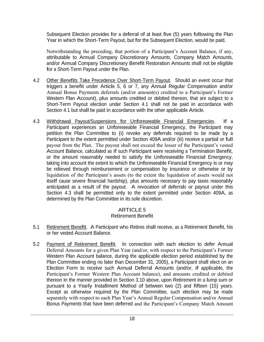 18 Subsequent Election provides for a deferral of at least five (5) years following the Plan Year in which the Short-Term Payout, but for the Subsequent Election, would be paid. Notwithstanding the preceding, that portion of a Participant’s Account Balance, if any, attributable to Annual Company Discretionary Amounts, Company Match Amounts, and/or Annual Company Discretionary Benefit Restoration Amounts shall not be eligible for a Short-Term Payout under the Plan. 4.2 Other Benefits Take Precedence Over Short-Term Payout. Should an event occur that triggers a benefit under Article 5, 6 or 7, any Annual Regular Compensation and/or Annual Bonus Payments deferrals (and/or amount(s) credited to a Participant’s Former Western Plan Account), plus amounts credited or debited thereon, that are subject to a Short-Term Payout election under Section 4.1 shall not be paid in accordance with Section 4.1 but shall be paid in accordance with the other applicable Article. 4.3 Withdrawal Payout/Suspensions for Unforeseeable Financial Emergencies. If a Participant experiences an Unforeseeable Financial Emergency, the Participant may petition the Plan Committee to (i) revoke any deferrals required to be made by a Participant to the extent permitted under Section 409A and/or (ii) receive a partial or full payout from the Plan. The payout shall not exceed the lesser of the Participant’s vested Account Balance, calculated as if such Participant were receiving a Termination Benefit, or the amount reasonably needed to satisfy the Unforeseeable Financial Emergency, taking into account the extent to which the Unforeseeable Financial Emergency is or may be relieved through reimbursement or compensation by insurance or otherwise or by liquidation of the Participant’s assets (to the extent the liquidation of assets would not itself cause severe financial hardship), plus amounts necessary to pay taxes reasonably anticipated as a result of the payout. A revocation of deferrals or payout under this Section 4.3 shall be permitted only to the extent permitted under Section 409A, as determined by the Plan Committee in its sole discretion. ARTICLE 5 Retirement Benefit 5.1 Retirement Benefit. A Participant who Retires shall receive, as a Retirement Benefit, his or her vested Account Balance. 5.2 Payment of Retirement Benefit. In connection with each election to defer Annual Deferral Amounts for a given Plan Year (and/or, with respect to the Participant’s Former Western Plan Account balance, during the applicable election period established by the Plan Committee ending no later than December 31, 2005), a Participant shall elect on an Election Form to receive such Annual Deferral Amounts (and/or, if applicable, the Participant’s Former Western Plan Account balance), and amounts credited or debited thereon in the manner provided in Section 3.10 above, upon Retirement in a lump sum or pursuant to a Yearly Installment Method of between two (2) and fifteen (15) years. Except as otherwise required by the Plan Committee, such election may be made separately with respect to each Plan Year’s Annual Regular Compensation and/or Annual Bonus Payments that have been deferred and the Participant’s Company Match Amount