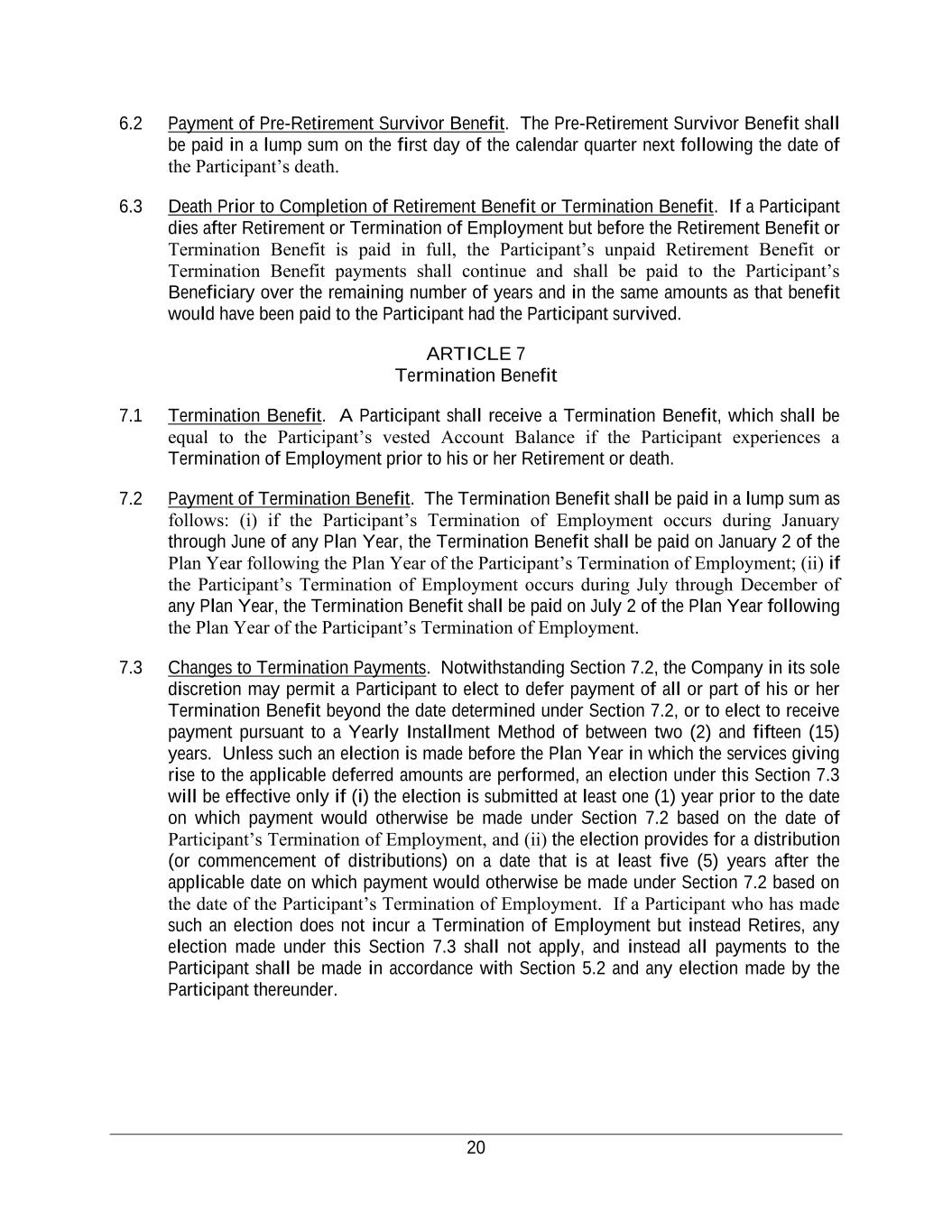 20 6.2 Payment of Pre-Retirement Survivor Benefit. The Pre-Retirement Survivor Benefit shall be paid in a lump sum on the first day of the calendar quarter next following the date of the Participant’s death. 6.3 Death Prior to Completion of Retirement Benefit or Termination Benefit. If a Participant dies after Retirement or Termination of Employment but before the Retirement Benefit or Termination Benefit is paid in full, the Participant’s unpaid Retirement Benefit or Termination Benefit payments shall continue and shall be paid to the Participant’s Beneficiary over the remaining number of years and in the same amounts as that benefit would have been paid to the Participant had the Participant survived. ARTICLE 7 Termination Benefit 7.1 Termination Benefit. A Participant shall receive a Termination Benefit, which shall be equal to the Participant’s vested Account Balance if the Participant experiences a Termination of Employment prior to his or her Retirement or death. 7.2 Payment of Termination Benefit. The Termination Benefit shall be paid in a lump sum as follows: (i) if the Participant’s Termination of Employment occurs during January through June of any Plan Year, the Termination Benefit shall be paid on January 2 of the Plan Year following the Plan Year of the Participant’s Termination of Employment; (ii) if the Participant’s Termination of Employment occurs during July through December of any Plan Year, the Termination Benefit shall be paid on July 2 of the Plan Year following the Plan Year of the Participant’s Termination of Employment. 7.3 Changes to Termination Payments. Notwithstanding Section 7.2, the Company in its sole discretion may permit a Participant to elect to defer payment of all or part of his or her Termination Benefit beyond the date determined under Section 7.2, or to elect to receive payment pursuant to a Yearly Installment Method of between two (2) and fifteen (15) years. Unless such an election is made before the Plan Year in which the services giving rise to the applicable deferred amounts are performed, an election under this Section 7.3 will be effective only if (i) the election is submitted at least one (1) year prior to the date on which payment would otherwise be made under Section 7.2 based on the date of Participant’s Termination of Employment, and (ii) the election provides for a distribution (or commencement of distributions) on a date that is at least five (5) years after the applicable date on which payment would otherwise be made under Section 7.2 based on the date of the Participant’s Termination of Employment. If a Participant who has made such an election does not incur a Termination of Employment but instead Retires, any election made under this Section 7.3 shall not apply, and instead all payments to the Participant shall be made in accordance with Section 5.2 and any election made by the Participant thereunder.