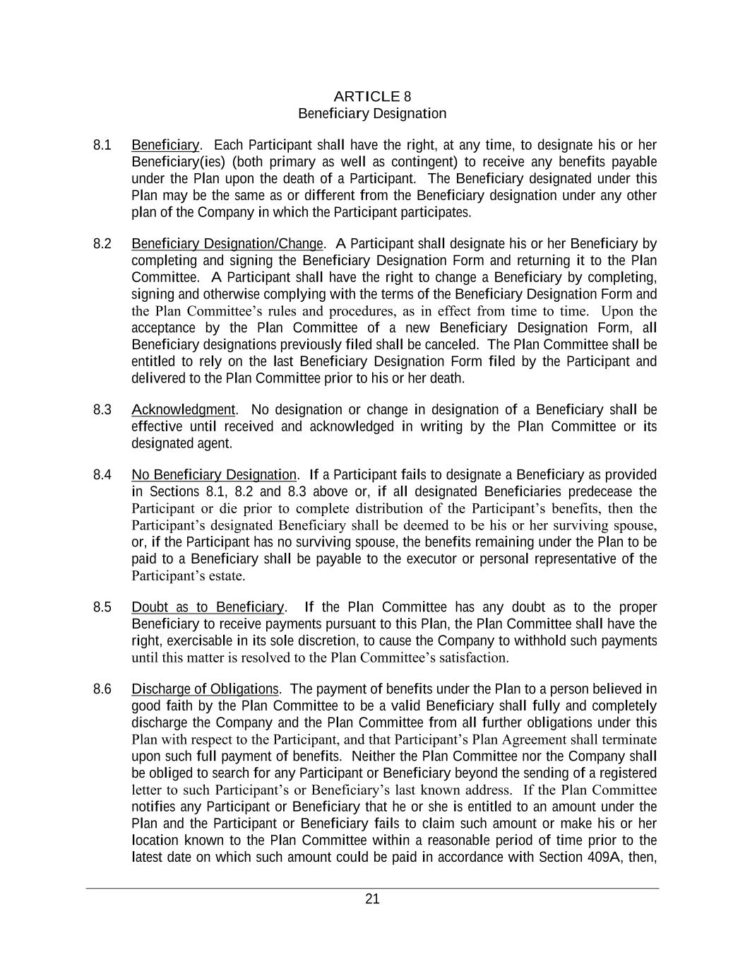 21 ARTICLE 8 Beneficiary Designation 8.1 Beneficiary. Each Participant shall have the right, at any time, to designate his or her Beneficiary(ies) (both primary as well as contingent) to receive any benefits payable under the Plan upon the death of a Participant. The Beneficiary designated under this Plan may be the same as or different from the Beneficiary designation under any other plan of the Company in which the Participant participates. 8.2 Beneficiary Designation/Change. A Participant shall designate his or her Beneficiary by completing and signing the Beneficiary Designation Form and returning it to the Plan Committee. A Participant shall have the right to change a Beneficiary by completing, signing and otherwise complying with the terms of the Beneficiary Designation Form and the Plan Committee’s rules and procedures, as in effect from time to time. Upon the acceptance by the Plan Committee of a new Beneficiary Designation Form, all Beneficiary designations previously filed shall be canceled. The Plan Committee shall be entitled to rely on the last Beneficiary Designation Form filed by the Participant and delivered to the Plan Committee prior to his or her death. 8.3 Acknowledgment. No designation or change in designation of a Beneficiary shall be effective until received and acknowledged in writing by the Plan Committee or its designated agent. 8.4 No Beneficiary Designation. If a Participant fails to designate a Beneficiary as provided in Sections 8.1, 8.2 and 8.3 above or, if all designated Beneficiaries predecease the Participant or die prior to complete distribution of the Participant’s benefits, then the Participant’s designated Beneficiary shall be deemed to be his or her surviving spouse, or, if the Participant has no surviving spouse, the benefits remaining under the Plan to be paid to a Beneficiary shall be payable to the executor or personal representative of the Participant’s estate. 8.5 Doubt as to Beneficiary. If the Plan Committee has any doubt as to the proper Beneficiary to receive payments pursuant to this Plan, the Plan Committee shall have the right, exercisable in its sole discretion, to cause the Company to withhold such payments until this matter is resolved to the Plan Committee’s satisfaction. 8.6 Discharge of Obligations. The payment of benefits under the Plan to a person believed in good faith by the Plan Committee to be a valid Beneficiary shall fully and completely discharge the Company and the Plan Committee from all further obligations under this Plan with respect to the Participant, and that Participant’s Plan Agreement shall terminate upon such full payment of benefits. Neither the Plan Committee nor the Company shall be obliged to search for any Participant or Beneficiary beyond the sending of a registered letter to such Participant’s or Beneficiary’s last known address. If the Plan Committee notifies any Participant or Beneficiary that he or she is entitled to an amount under the Plan and the Participant or Beneficiary fails to claim such amount or make his or her location known to the Plan Committee within a reasonable period of time prior to the latest date on which such amount could be paid in accordance with Section 409A, then,