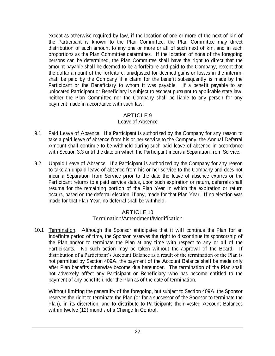 22 except as otherwise required by law, if the location of one or more of the next of kin of the Participant is known to the Plan Committee, the Plan Committee may direct distribution of such amount to any one or more or all of such next of kin, and in such proportions as the Plan Committee determines. If the location of none of the foregoing persons can be determined, the Plan Committee shall have the right to direct that the amount payable shall be deemed to be a forfeiture and paid to the Company, except that the dollar amount of the forfeiture, unadjusted for deemed gains or losses in the interim, shall be paid by the Company if a claim for the benefit subsequently is made by the Participant or the Beneficiary to whom it was payable. If a benefit payable to an unlocated Participant or Beneficiary is subject to escheat pursuant to applicable state law, neither the Plan Committee nor the Company shall be liable to any person for any payment made in accordance with such law. ARTICLE 9 Leave of Absence 9.1 Paid Leave of Absence. If a Participant is authorized by the Company for any reason to take a paid leave of absence from his or her service to the Company, the Annual Deferral Amount shall continue to be withheld during such paid leave of absence in accordance with Section 3.3 until the date on which the Participant incurs a Separation from Service. 9.2 Unpaid Leave of Absence. If a Participant is authorized by the Company for any reason to take an unpaid leave of absence from his or her service to the Company and does not incur a Separation from Service prior to the date the leave of absence expires or the Participant returns to a paid service status, upon such expiration or return, deferrals shall resume for the remaining portion of the Plan Year in which the expiration or return occurs, based on the deferral election, if any, made for that Plan Year. If no election was made for that Plan Year, no deferral shall be withheld. ARTICLE 10 Termination/Amendment/Modification 10.1 Termination. Although the Sponsor anticipates that it will continue the Plan for an indefinite period of time, the Sponsor reserves the right to discontinue its sponsorship of the Plan and/or to terminate the Plan at any time with respect to any or all of the Participants. No such action may be taken without the approval of the Board. If distribution of a Participant’s Account Balance as a result of the termination of the Plan is not permitted by Section 409A, the payment of the Account Balance shall be made only after Plan benefits otherwise become due hereunder. The termination of the Plan shall not adversely affect any Participant or Beneficiary who has become entitled to the payment of any benefits under the Plan as of the date of termination. Without limiting the generality of the foregoing, but subject to Section 409A, the Sponsor reserves the right to terminate the Plan (or for a successor of the Sponsor to terminate the Plan), in its discretion, and to distribute to Participants their vested Account Balances within twelve (12) months of a Change In Control.