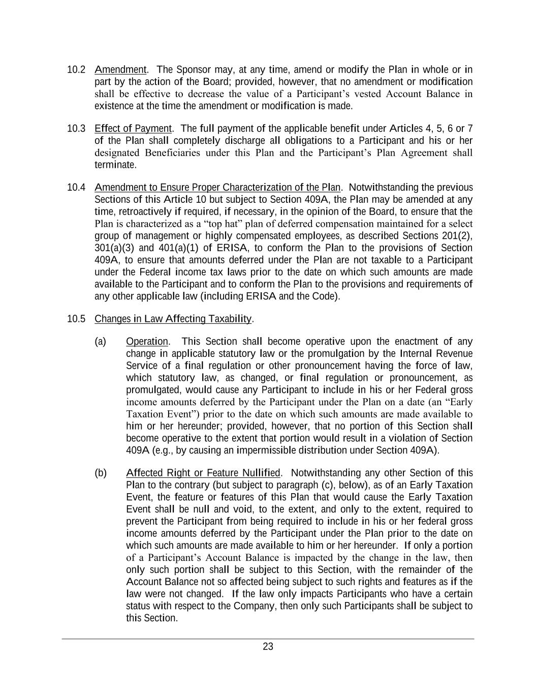 23 10.2 Amendment. The Sponsor may, at any time, amend or modify the Plan in whole or in part by the action of the Board; provided, however, that no amendment or modification shall be effective to decrease the value of a Participant’s vested Account Balance in existence at the time the amendment or modification is made. 10.3 Effect of Payment. The full payment of the applicable benefit under Articles 4, 5, 6 or 7 of the Plan shall completely discharge all obligations to a Participant and his or her designated Beneficiaries under this Plan and the Participant’s Plan Agreement shall terminate. 10.4 Amendment to Ensure Proper Characterization of the Plan. Notwithstanding the previous Sections of this Article 10 but subject to Section 409A, the Plan may be amended at any time, retroactively if required, if necessary, in the opinion of the Board, to ensure that the Plan is characterized as a “top hat” plan of deferred compensation maintained for a select group of management or highly compensated employees, as described Sections 201(2), 301(a)(3) and 401(a)(1) of ERISA, to conform the Plan to the provisions of Section 409A, to ensure that amounts deferred under the Plan are not taxable to a Participant under the Federal income tax laws prior to the date on which such amounts are made available to the Participant and to conform the Plan to the provisions and requirements of any other applicable law (including ERISA and the Code). 10.5 Changes in Law Affecting Taxability. (a) Operation. This Section shall become operative upon the enactment of any change in applicable statutory law or the promulgation by the Internal Revenue Service of a final regulation or other pronouncement having the force of law, which statutory law, as changed, or final regulation or pronouncement, as promulgated, would cause any Participant to include in his or her Federal gross income amounts deferred by the Participant under the Plan on a date (an “Early Taxation Event”) prior to the date on which such amounts are made available to him or her hereunder; provided, however, that no portion of this Section shall become operative to the extent that portion would result in a violation of Section 409A (e.g., by causing an impermissible distribution under Section 409A). (b) Affected Right or Feature Nullified. Notwithstanding any other Section of this Plan to the contrary (but subject to paragraph (c), below), as of an Early Taxation Event, the feature or features of this Plan that would cause the Early Taxation Event shall be null and void, to the extent, and only to the extent, required to prevent the Participant from being required to include in his or her federal gross income amounts deferred by the Participant under the Plan prior to the date on which such amounts are made available to him or her hereunder. If only a portion of a Participant’s Account Balance is impacted by the change in the law, then only such portion shall be subject to this Section, with the remainder of the Account Balance not so affected being subject to such rights and features as if the law were not changed. If the law only impacts Participants who have a certain status with respect to the Company, then only such Participants shall be subject to this Section.