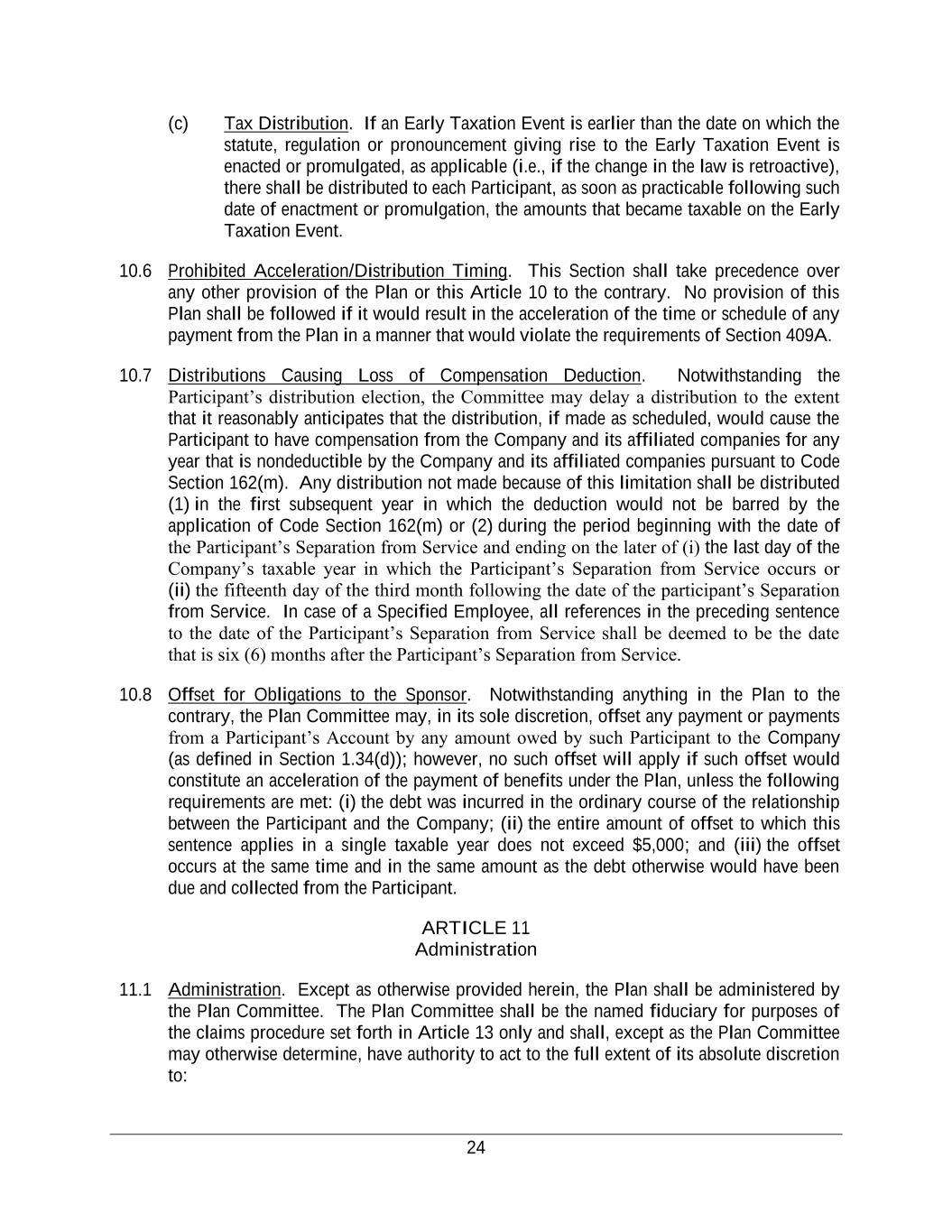 24 (c) Tax Distribution. If an Early Taxation Event is earlier than the date on which the statute, regulation or pronouncement giving rise to the Early Taxation Event is enacted or promulgated, as applicable (i.e., if the change in the law is retroactive), there shall be distributed to each Participant, as soon as practicable following such date of enactment or promulgation, the amounts that became taxable on the Early Taxation Event. 10.6 Prohibited Acceleration/Distribution Timing. This Section shall take precedence over any other provision of the Plan or this Article 10 to the contrary. No provision of this Plan shall be followed if it would result in the acceleration of the time or schedule of any payment from the Plan in a manner that would violate the requirements of Section 409A. 10.7 Distributions Causing Loss of Compensation Deduction. Notwithstanding the Participant’s distribution election, the Committee may delay a distribution to the extent that it reasonably anticipates that the distribution, if made as scheduled, would cause the Participant to have compensation from the Company and its affiliated companies for any year that is nondeductible by the Company and its affiliated companies pursuant to Code Section 162(m). Any distribution not made because of this limitation shall be distributed (1) in the first subsequent year in which the deduction would not be barred by the application of Code Section 162(m) or (2) during the period beginning with the date of the Participant’s Separation from Service and ending on the later of (i) the last day of the Company’s taxable year in which the Participant’s Separation from Service occurs or (ii) the fifteenth day of the third month following the date of the participant’s Separation from Service. In case of a Specified Employee, all references in the preceding sentence to the date of the Participant’s Separation from Service shall be deemed to be the date that is six (6) months after the Participant’s Separation from Service. 10.8 Offset for Obligations to the Sponsor. Notwithstanding anything in the Plan to the contrary, the Plan Committee may, in its sole discretion, offset any payment or payments from a Participant’s Account by any amount owed by such Participant to the Company (as defined in Section 1.34(d)); however, no such offset will apply if such offset would constitute an acceleration of the payment of benefits under the Plan, unless the following requirements are met: (i) the debt was incurred in the ordinary course of the relationship between the Participant and the Company; (ii) the entire amount of offset to which this sentence applies in a single taxable year does not exceed $5,000; and (iii) the offset occurs at the same time and in the same amount as the debt otherwise would have been due and collected from the Participant. ARTICLE 11 Administration 11.1 Administration. Except as otherwise provided herein, the Plan shall be administered by the Plan Committee. The Plan Committee shall be the named fiduciary for purposes of the claims procedure set forth in Article 13 only and shall, except as the Plan Committee may otherwise determine, have authority to act to the full extent of its absolute discretion to: